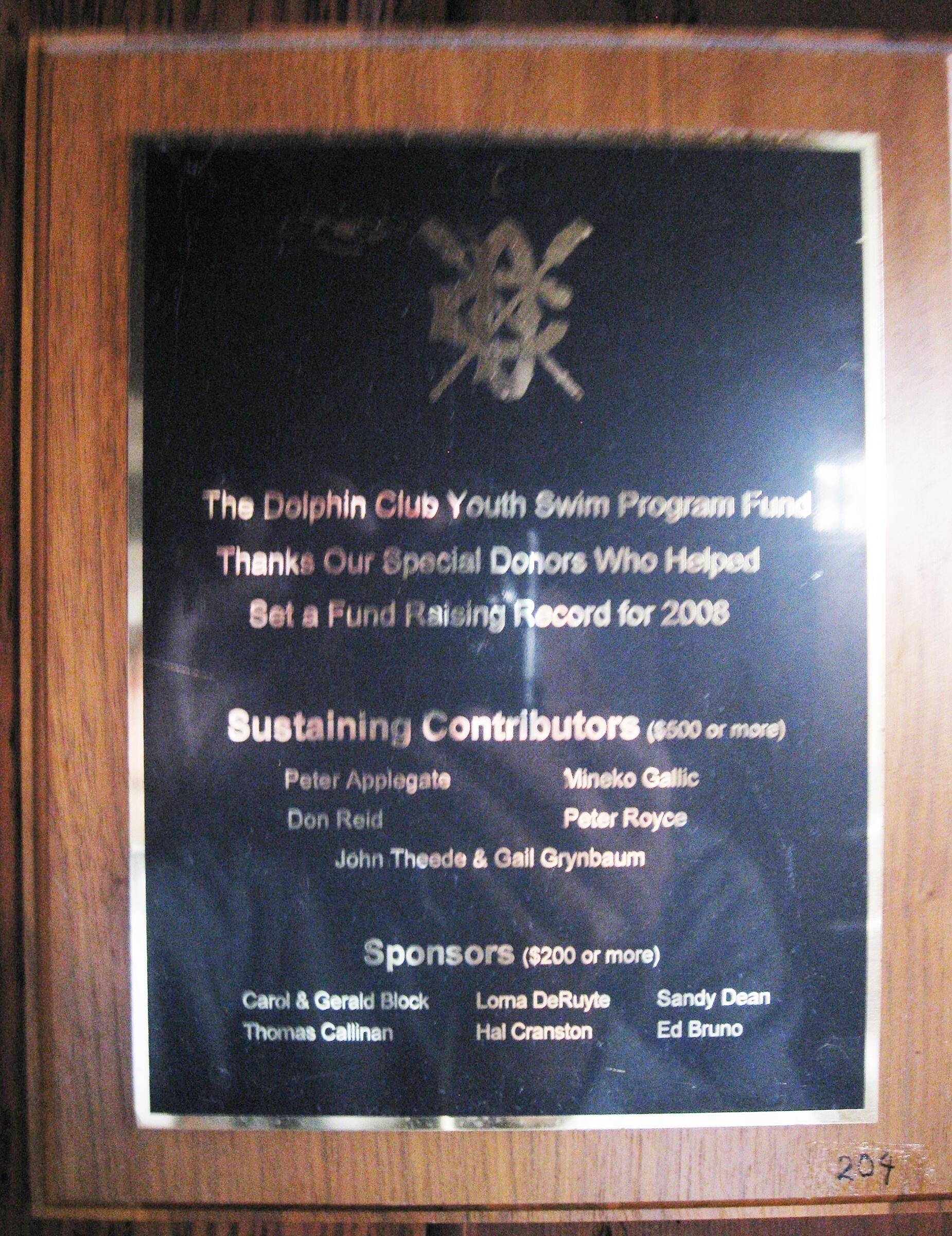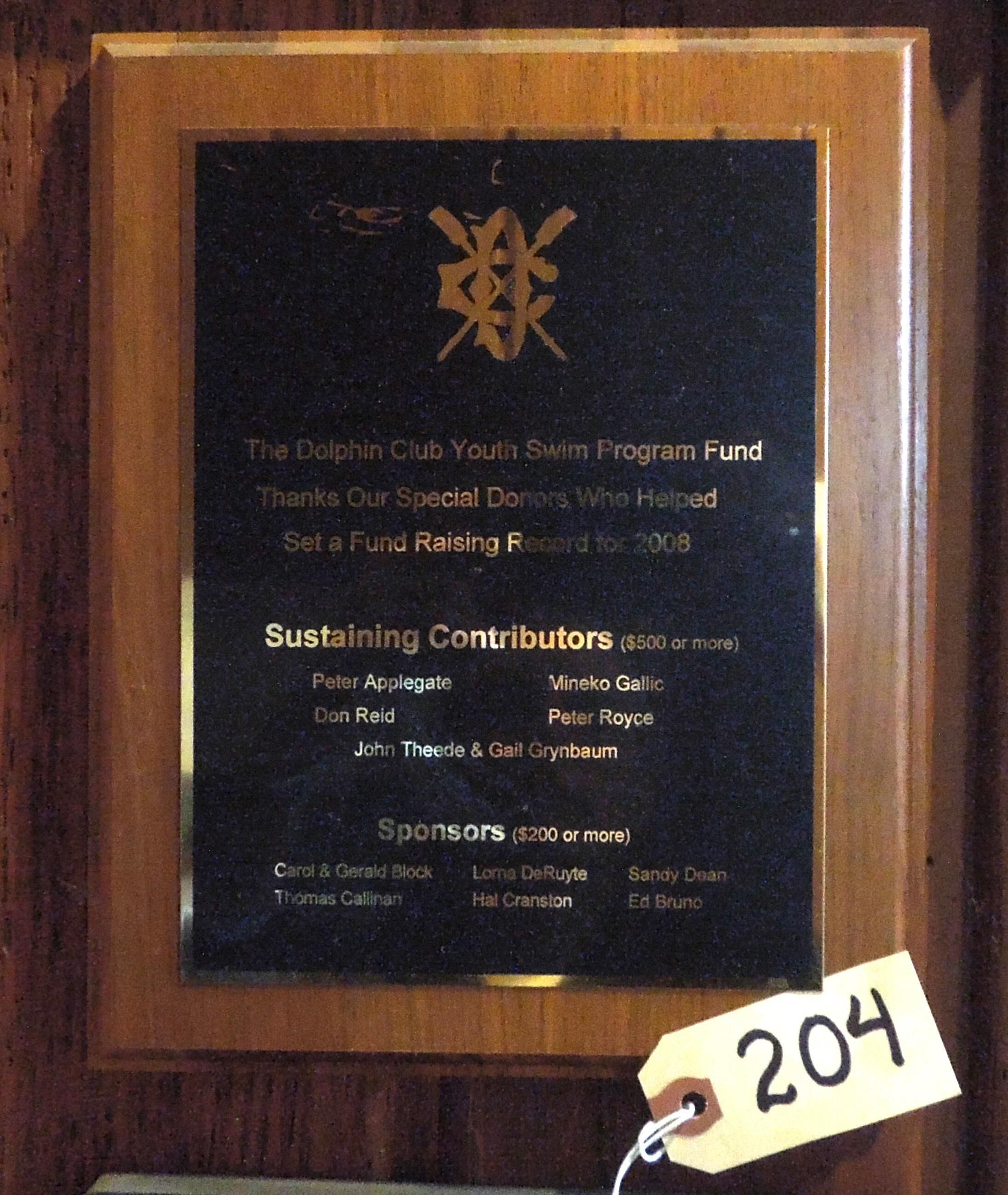 Wooden plaque with metal plate; text on plate out Swim Program Fund - Thanks Our Special Donors Who Helped - Set a Fund Raising Record for 2008." Lists names of donors of Sustaining Contributors $500+ and Sponsors $200+Made/Created
