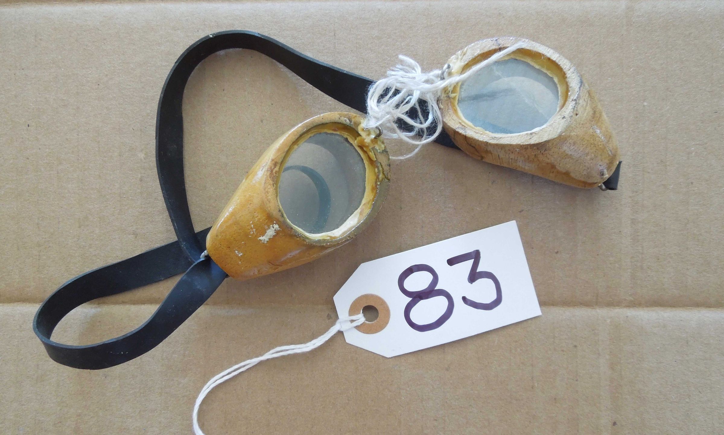 Wooden goggles, glass lenses, string nosepiece, metal brackets, rubber strap