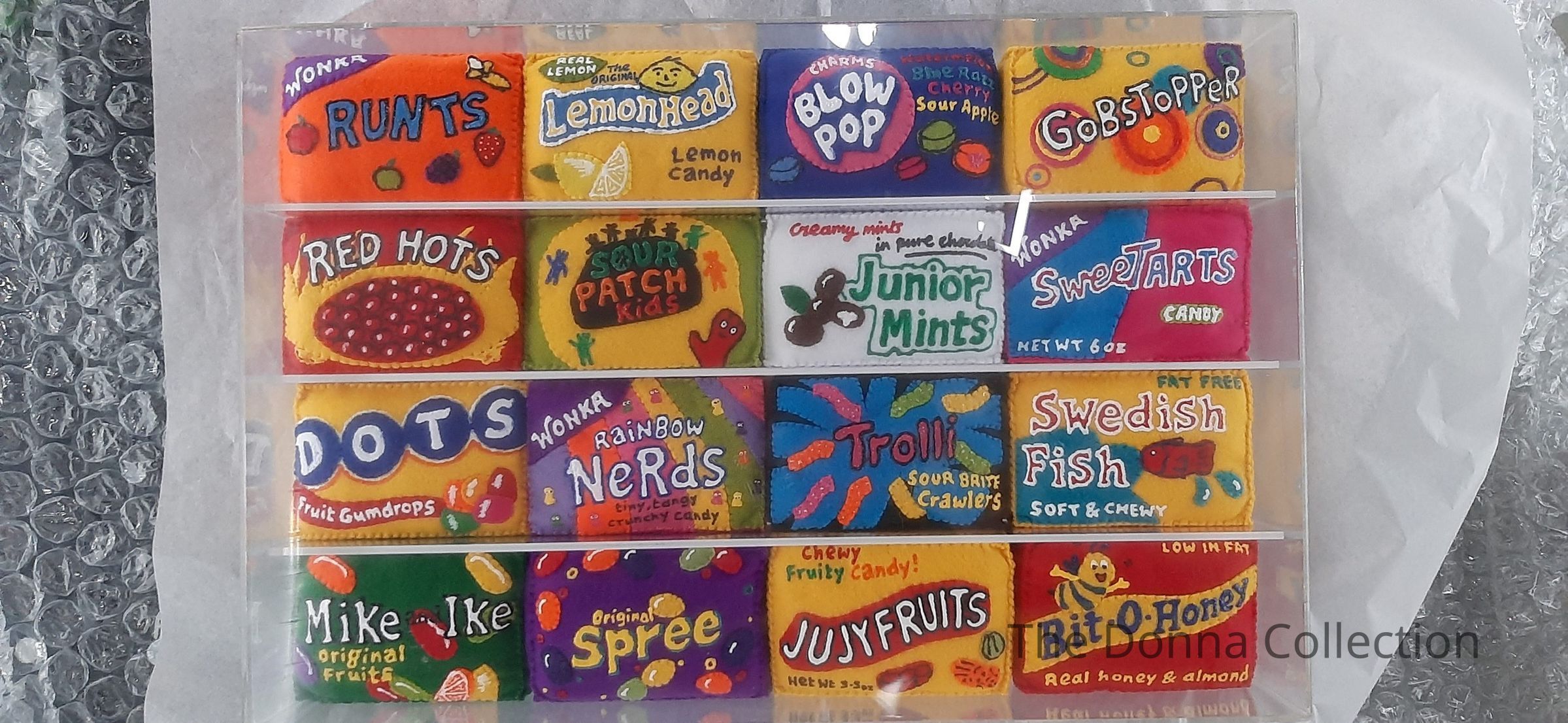 The artwork features sixteen meticulously crafted felt replicas of classic American candy boxes, arranged in a grid and encased in a clear Perspex frame. Each piece is hand-stitched and painted, showcasing Sparrow's attention to detail and her commentary on consumer culture.Artwork Details
