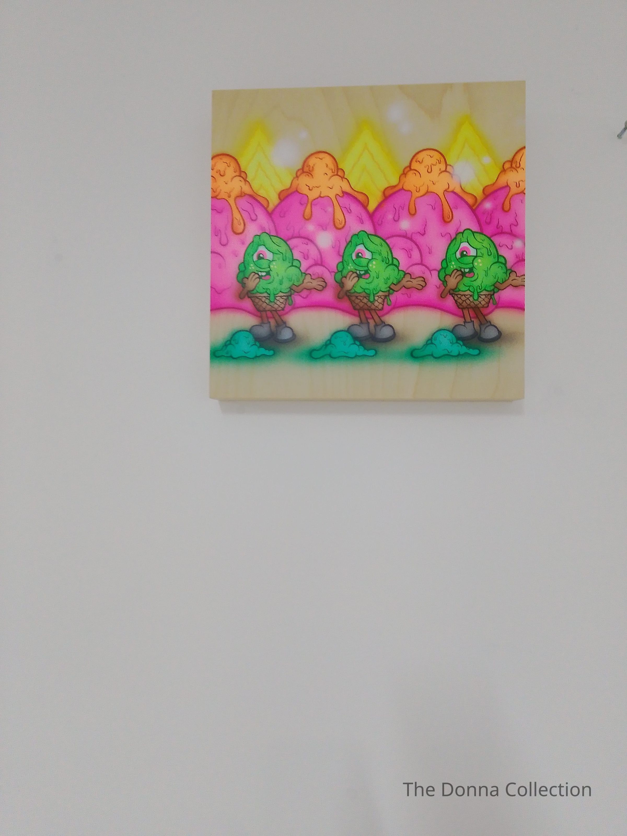 A sugar-rush swirl of pop surrealism, Buff Monster’s Melty series oozes attitude and imagination. This wood-panel original is a candy-colored confrontation—bright, bizarre, and boldly irreverent.