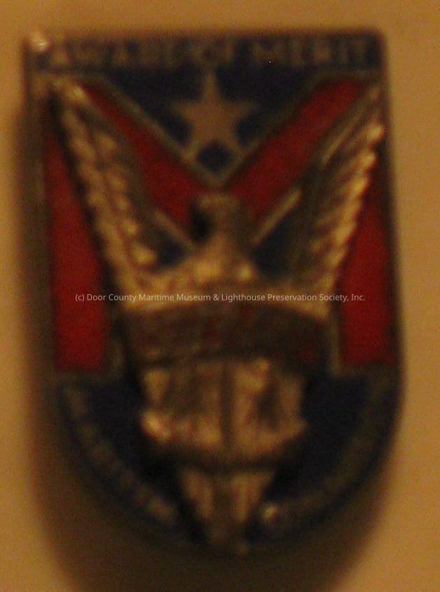 Pin with silver eagle center, Blue top and bottom, red sides. Merchant Marine, ships for victory.