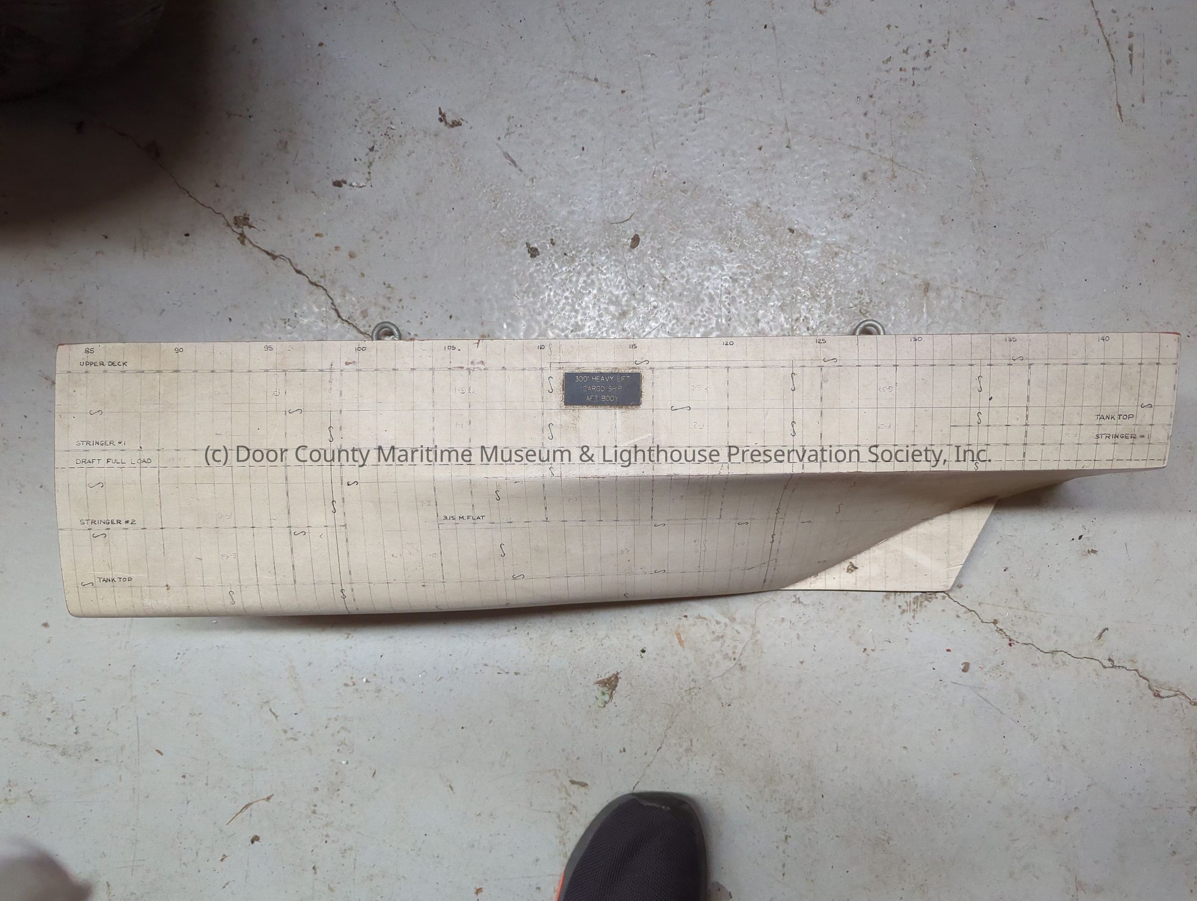 Half hull plating model of the vessel Paul Bunyan. Shell platting. Black plastic plaque with print. Two metal screw hangers
