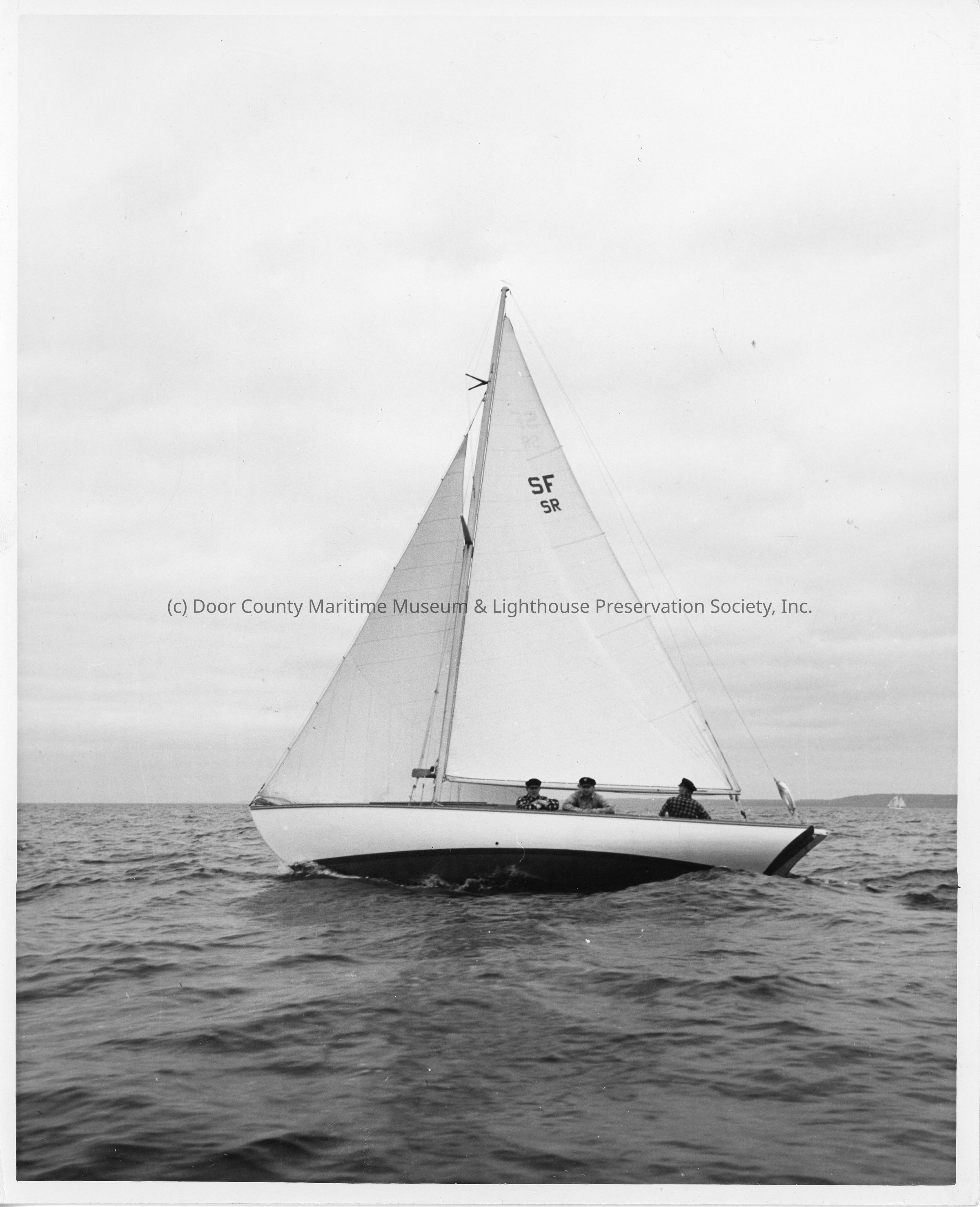 1 masted sailboat with 3 men aboard