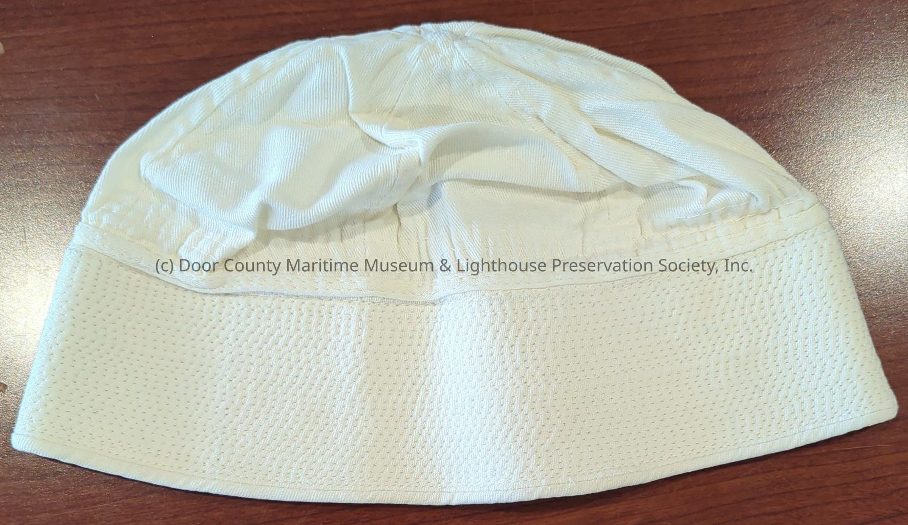 White cap with brim rolled to form vertical surface