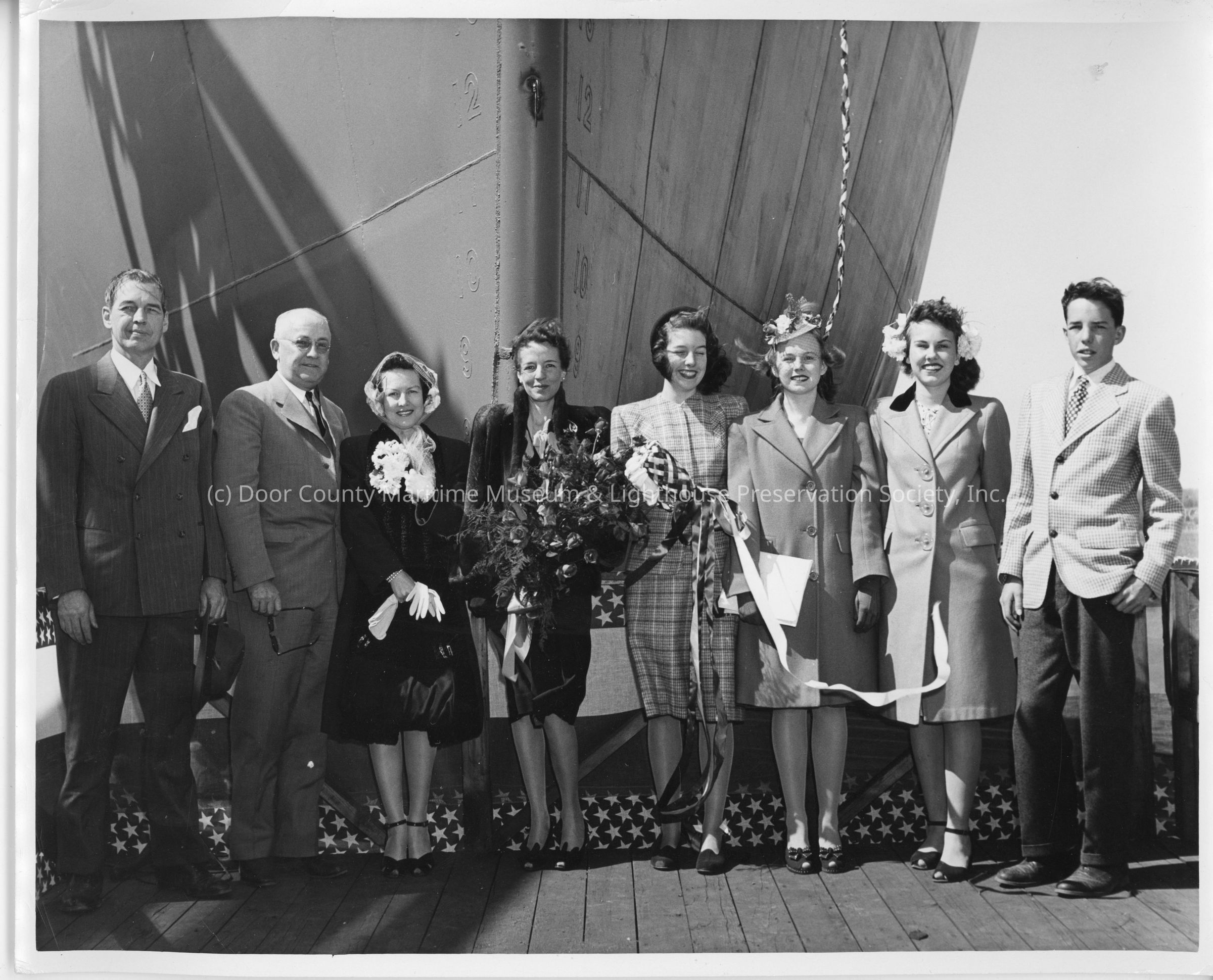 Suzanne, Patsy, L.D., and Alva Smith in front of bow of K-216 TraverseEntry/Object ID