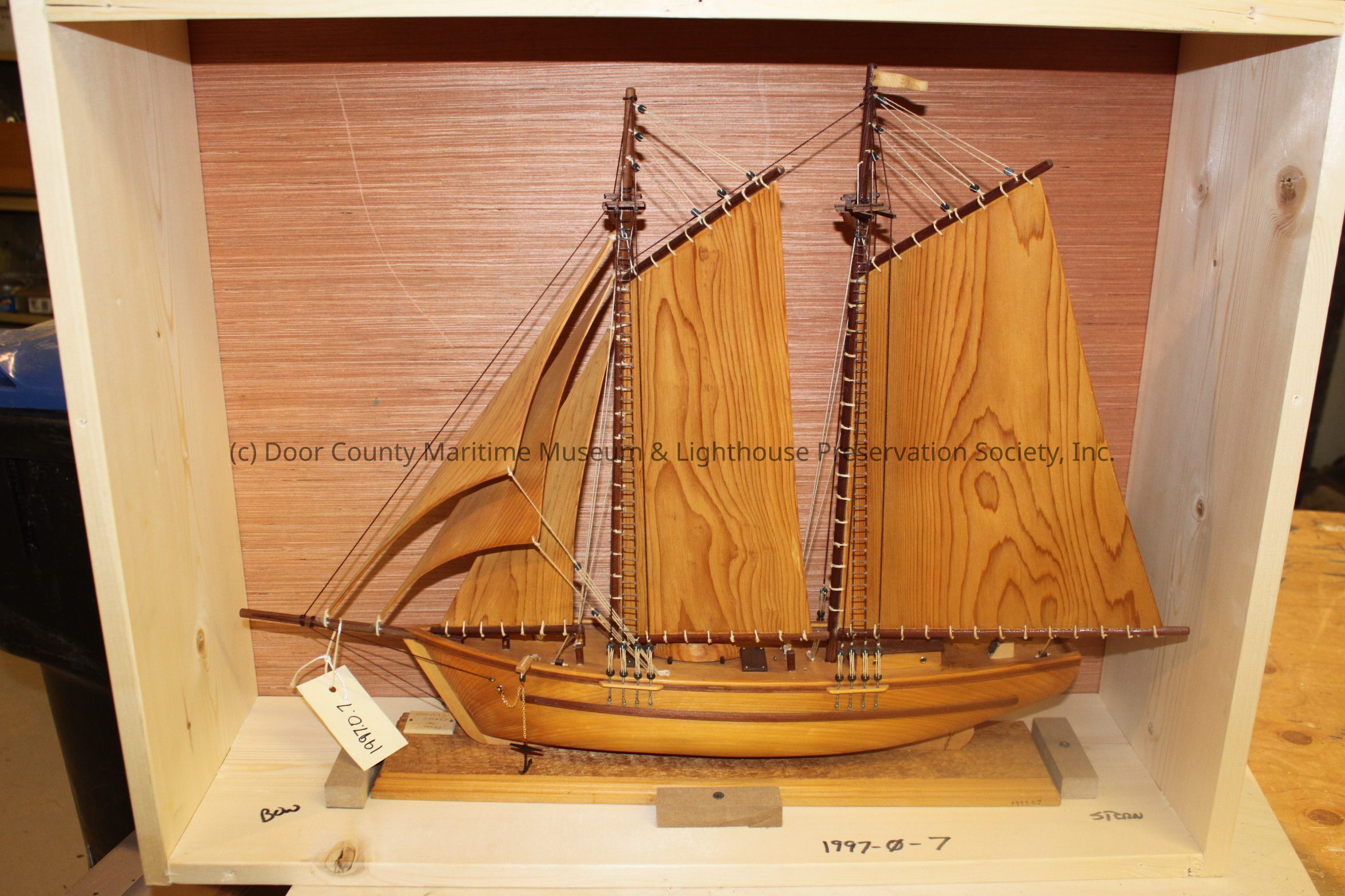 2 Masted Canadian Schooner; blond wood with dark brown trim and masts; White string rope attaching sails to mast; dark brown string rope and rope ladders on either side of masts; 3 smaller sails on fore of schooner; gold metal chain and plastic anchor, wooden life boat on deck