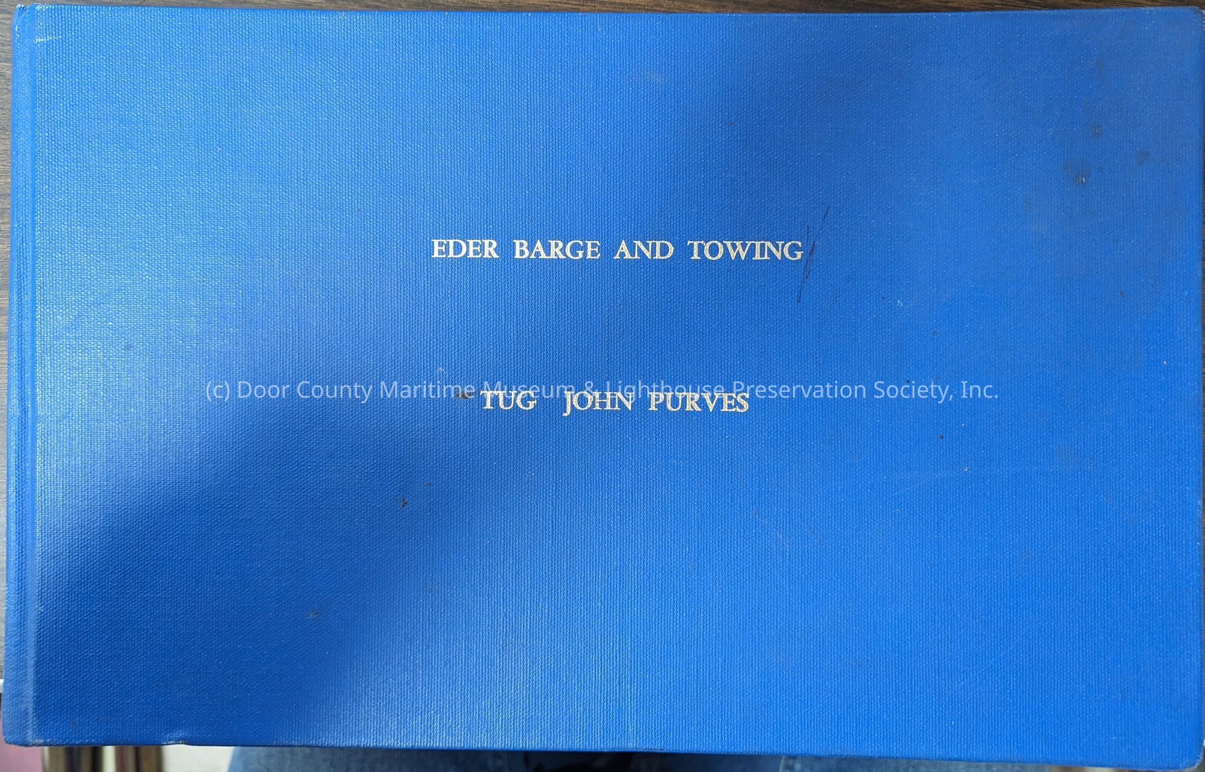 Dark blue hard cover ships log. Silve text stating "Eder Barge and Towing Tug John Purves"