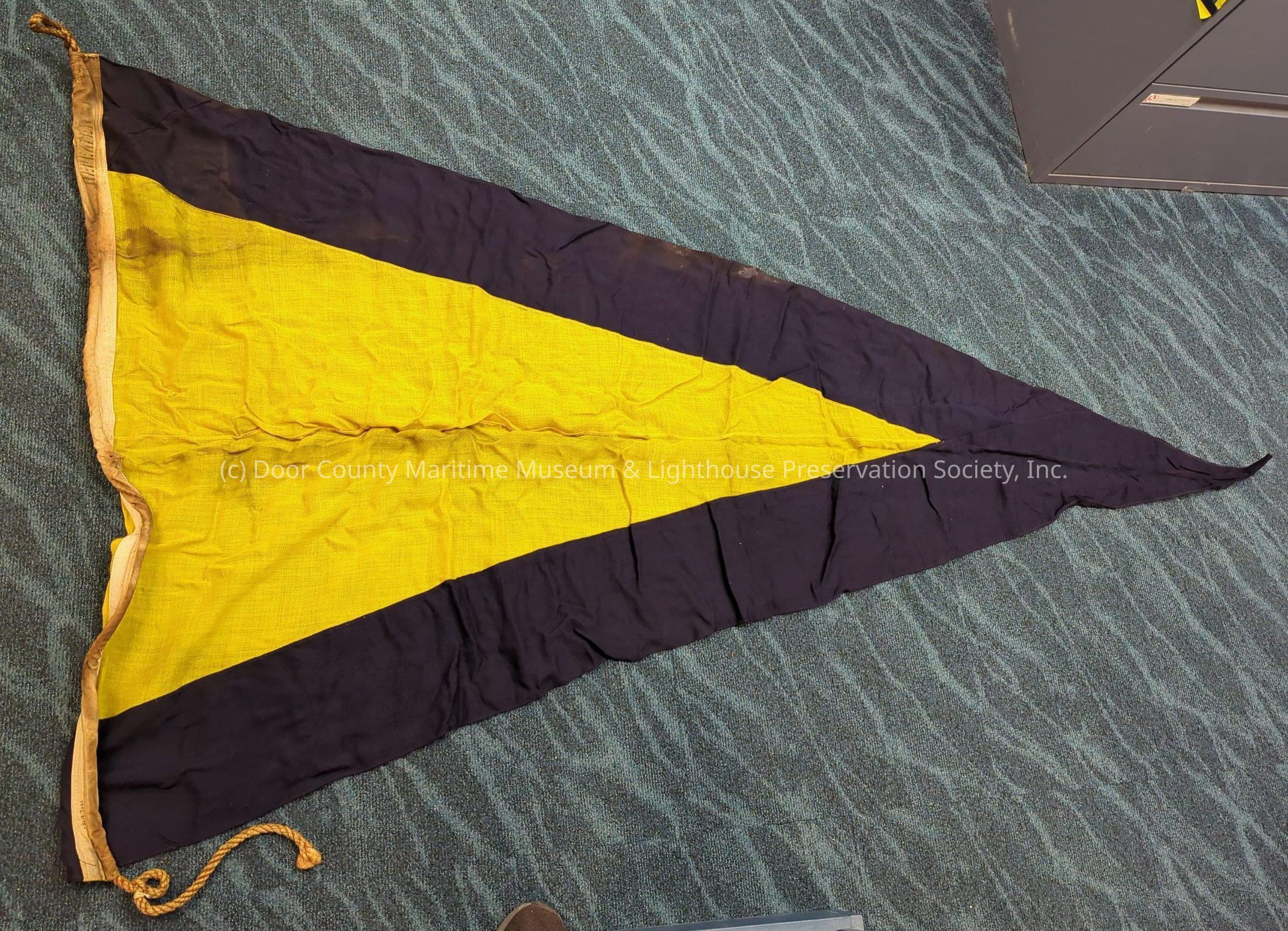 Signal flag: "Second Repeater"; tapered; left 2/3 blue; right 1/3 (tapered end) white; dirty.Location