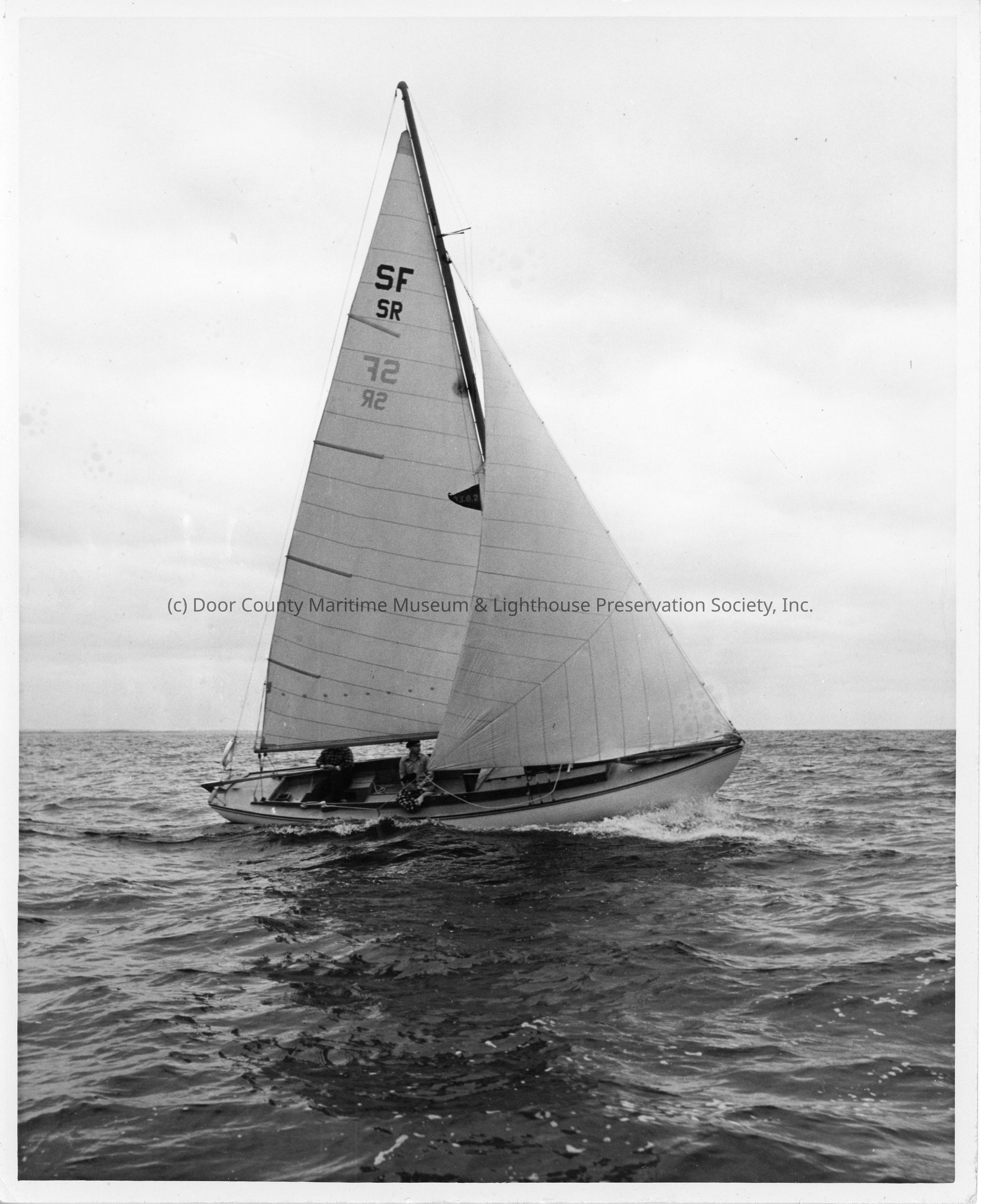 3 men in sailboat with letters SFSR on sails