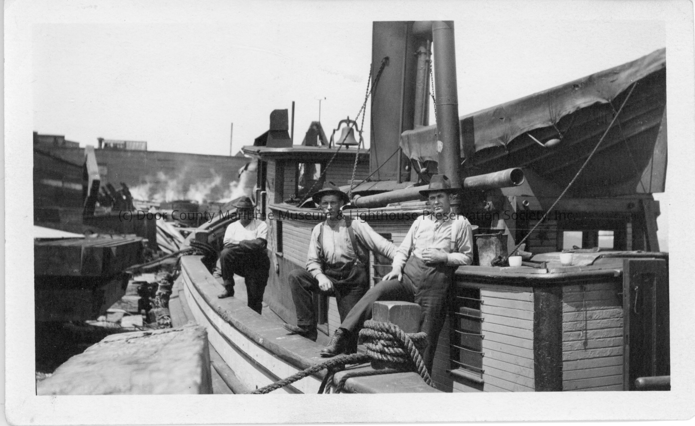 Three men standing on deck of docked vessel