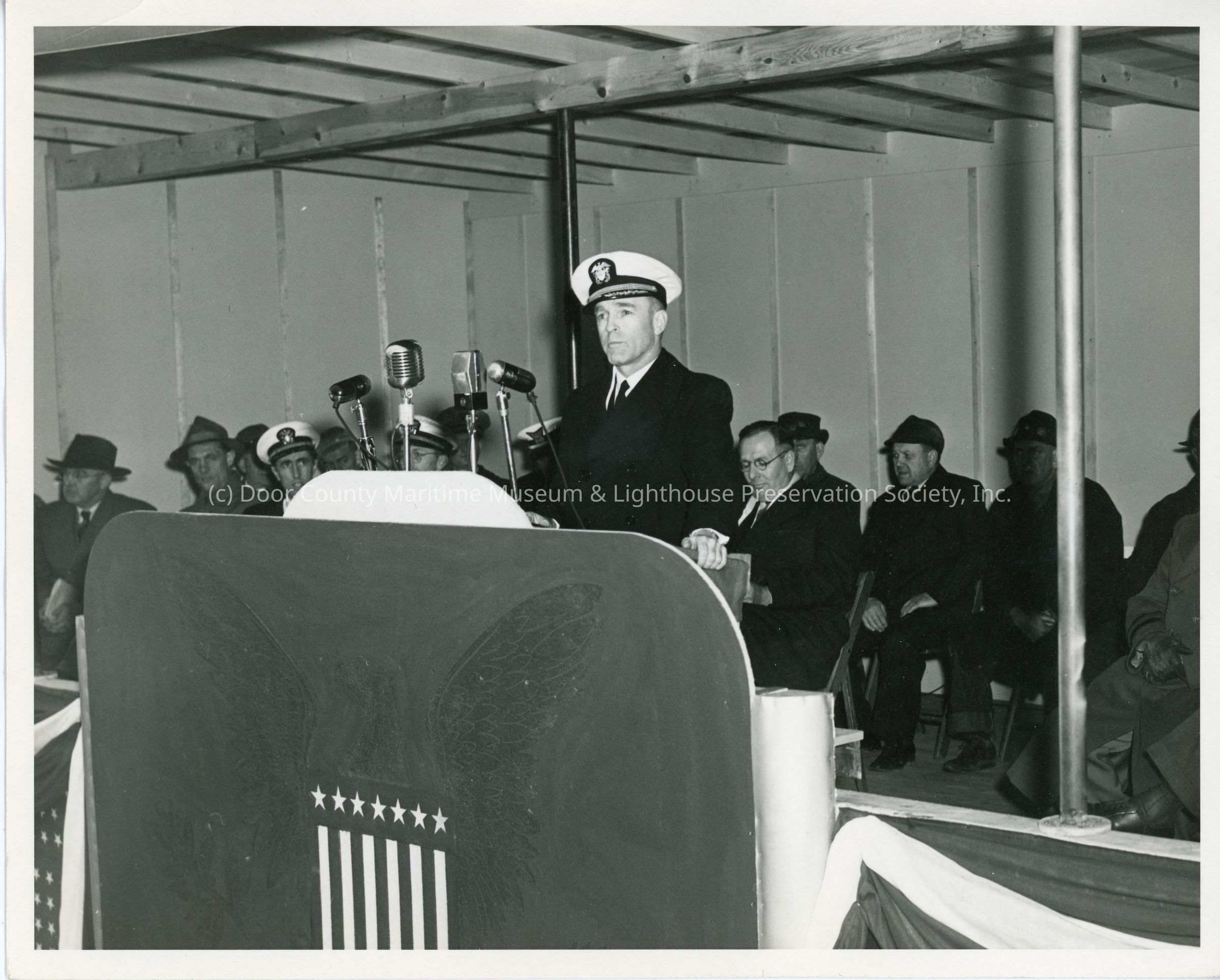 Man giving talk at Army Navy E award ceremony at Sturgeon Bay Shipbuilding and Drydock Company April 20, 1944Entry/Object ID