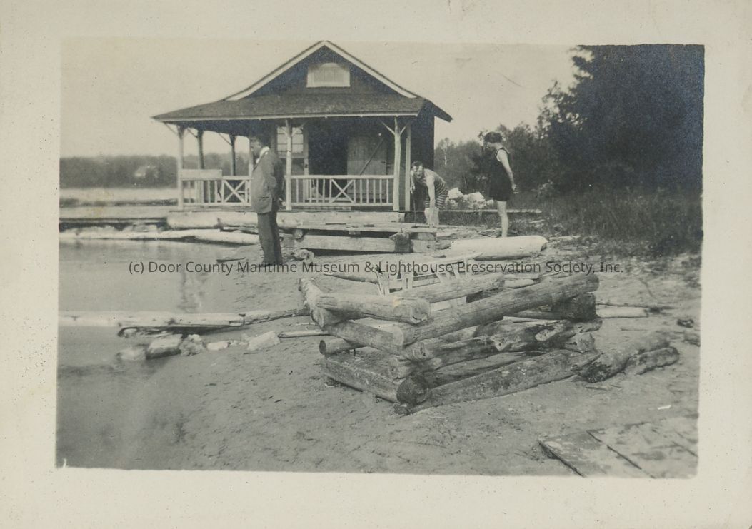 Worker sawing as part of building pier support. Woman in swimsuit looks on. Man in business suit sands nearby.Location