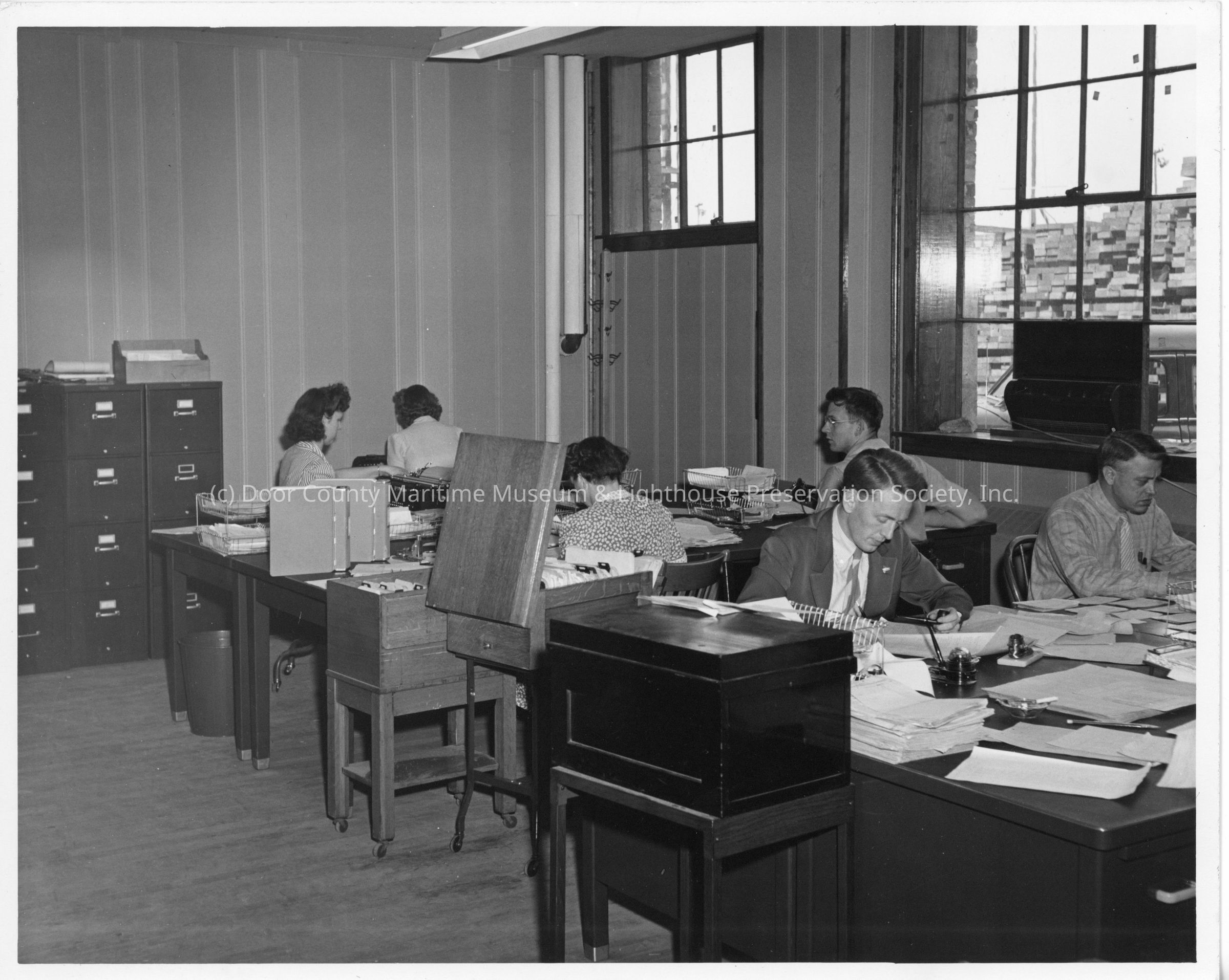Six unidentified people seated at desks July 29, 1942Entry/Object ID