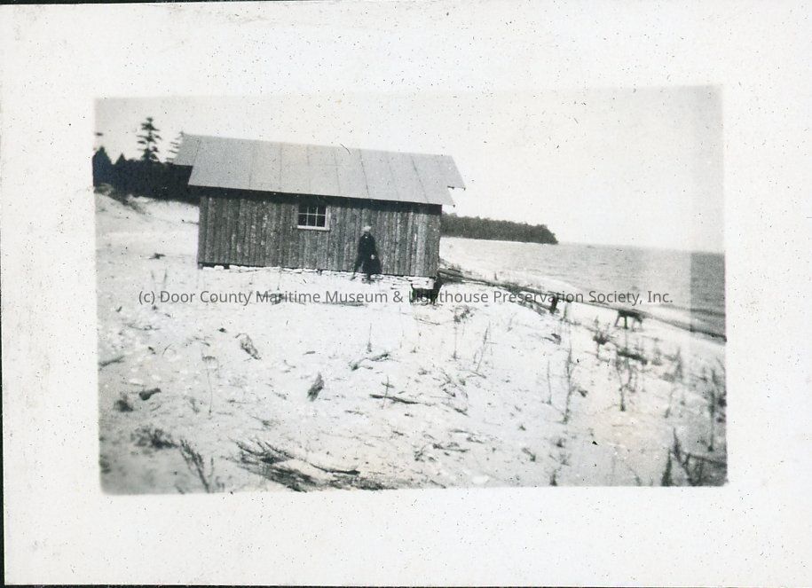 Donald Kincaide stands in front of a boathouse near the shore. With him is a small dog.Location