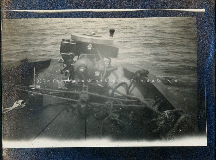 Motor in a skiff identified as Our Evninrude, August 26, in Hotz album. 1923