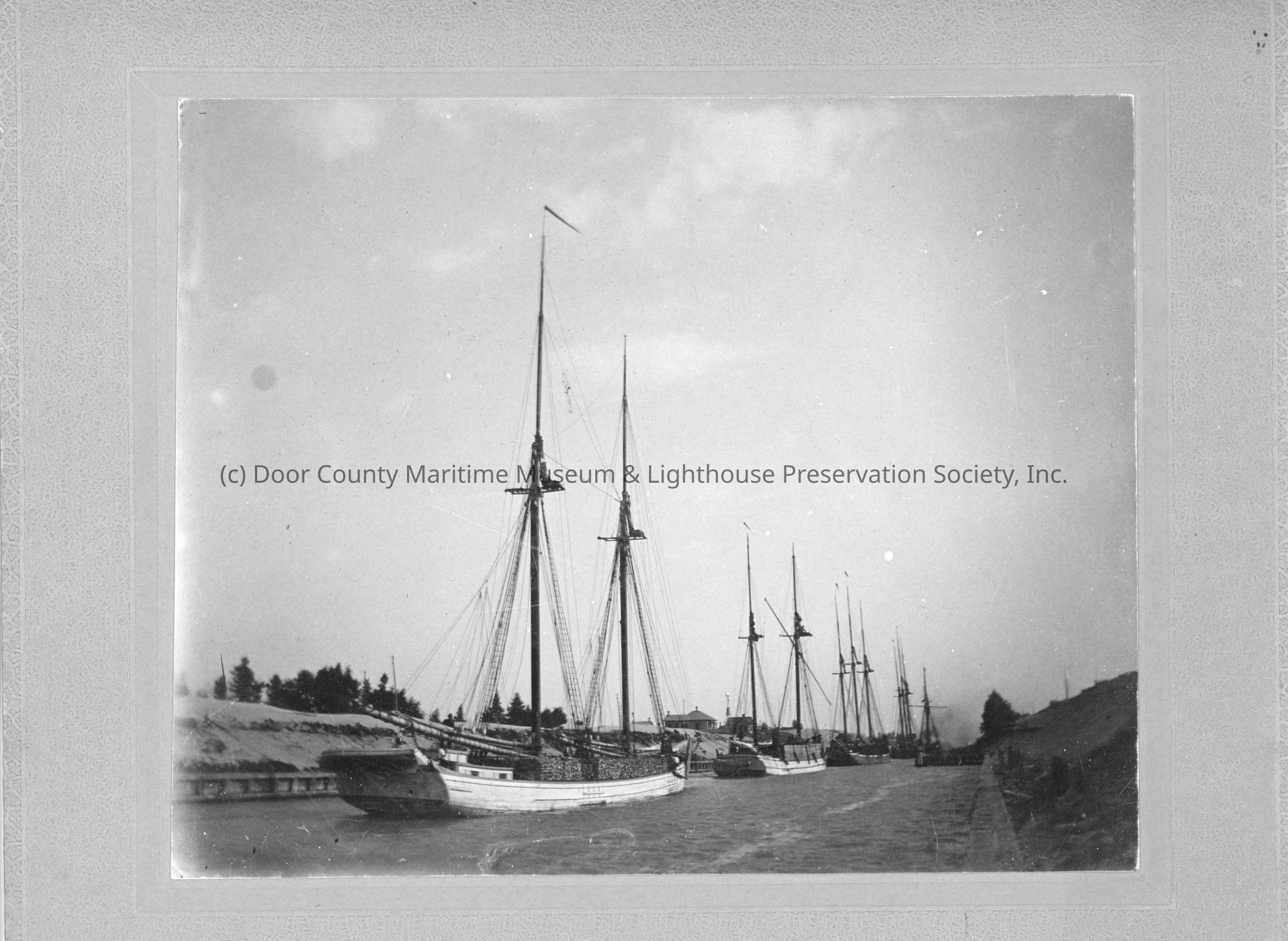5 schooners being towed through canal
