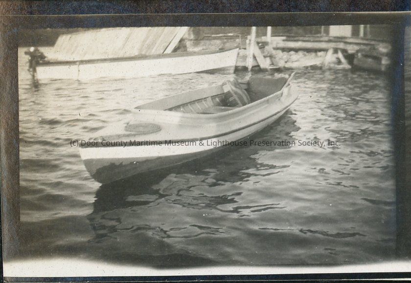 Fedy Hotz's duckboat at the beach in Fish Creek. The family's Evinrude is docked in the background. August 1924Location