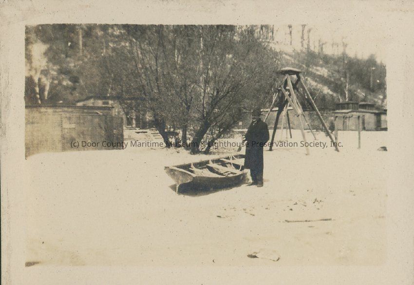 An unidentified man stands next to a rowboat. In the background are other shacks, including the one shown in 359. On the shore in Highland Park, Illinois.Location