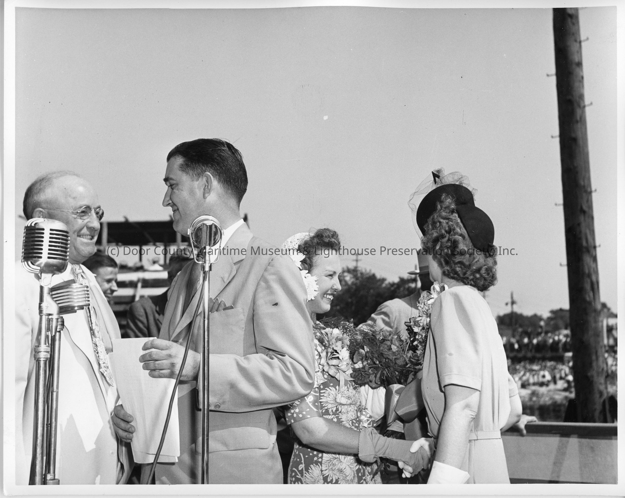L. D. Smith, Alva Smith, and Mrs. Gus Johnson near mircrophoneEntry/Object ID