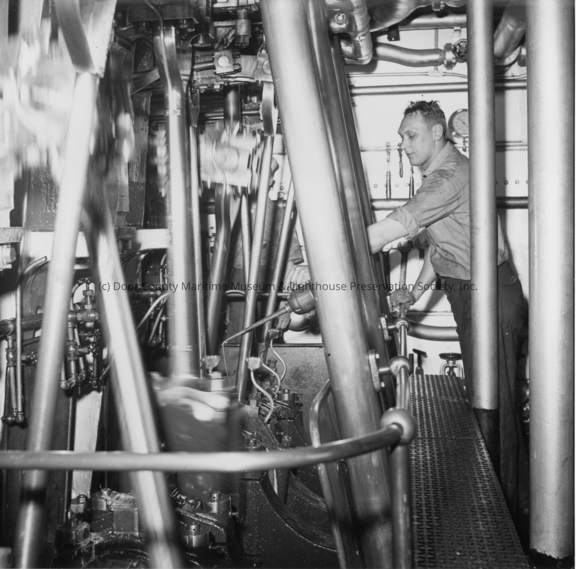 Crewman oiling engine of the lighthouse tender HollyhockLocation