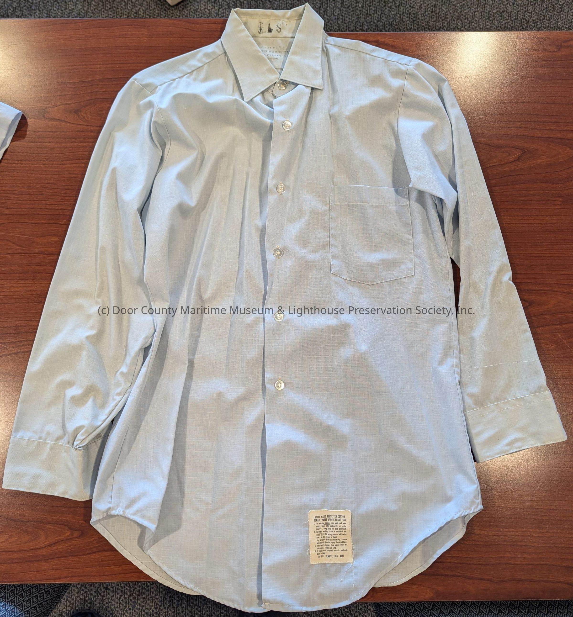 Light blue button up shirt. One breast pocket on upper left side. Manufacturing tag on lower leftLocation