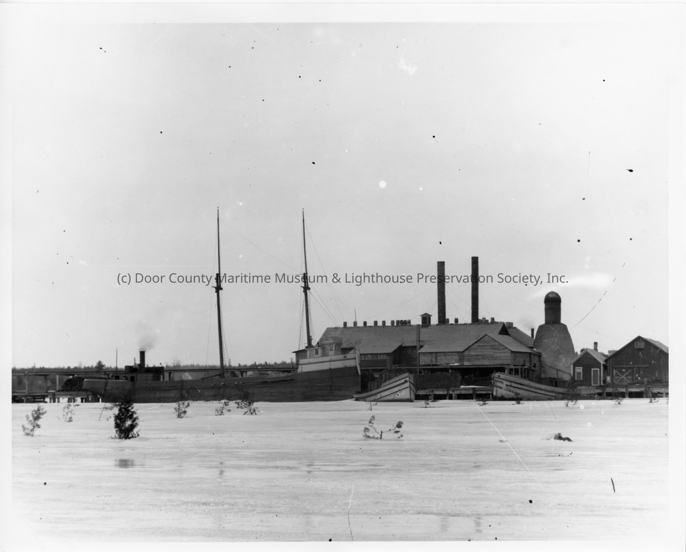 Vessels dockside in winter with buildings in background