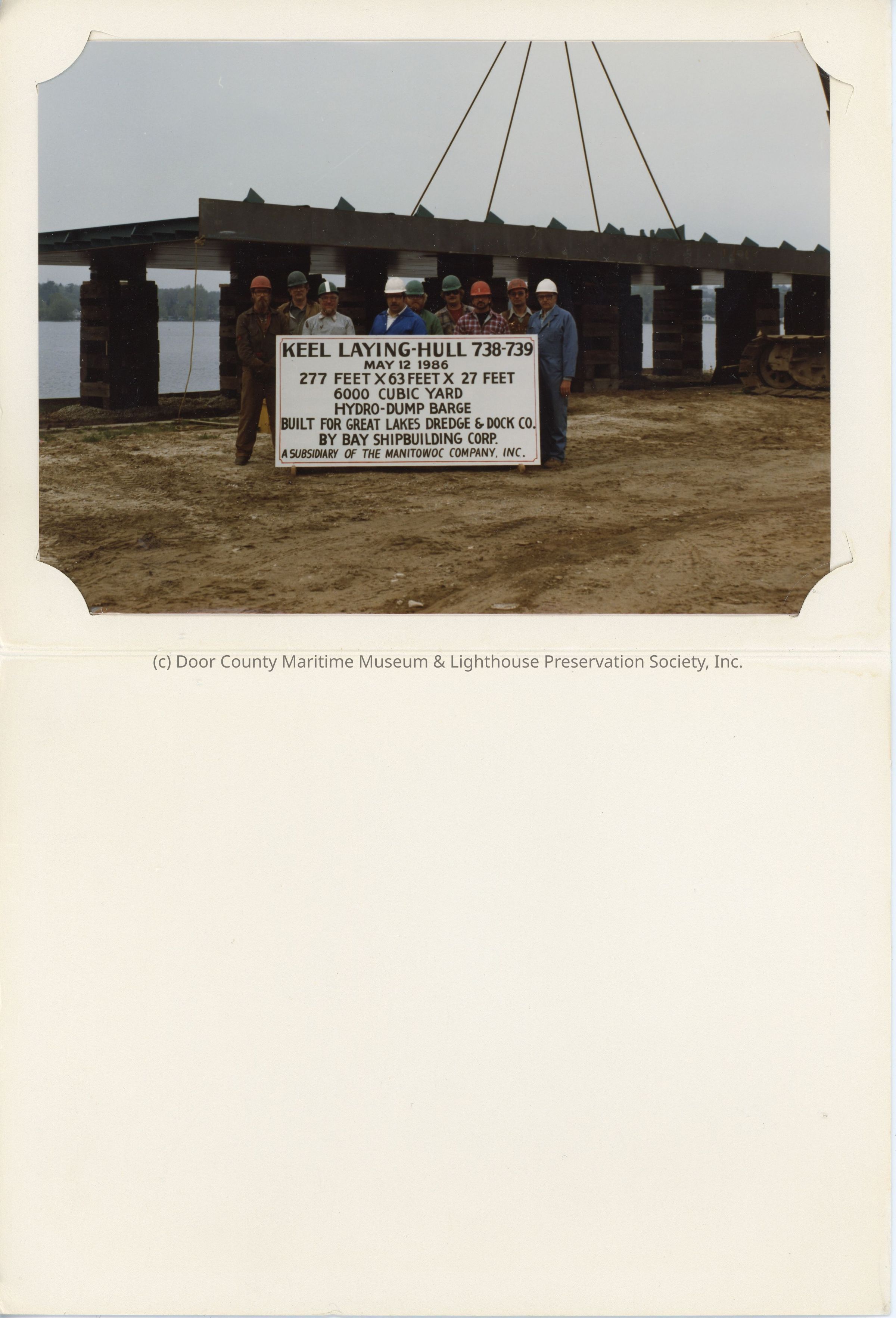 Crew of 9 men standing in back of sign for Keel laying Hull-738-739 1986Entry/Object ID