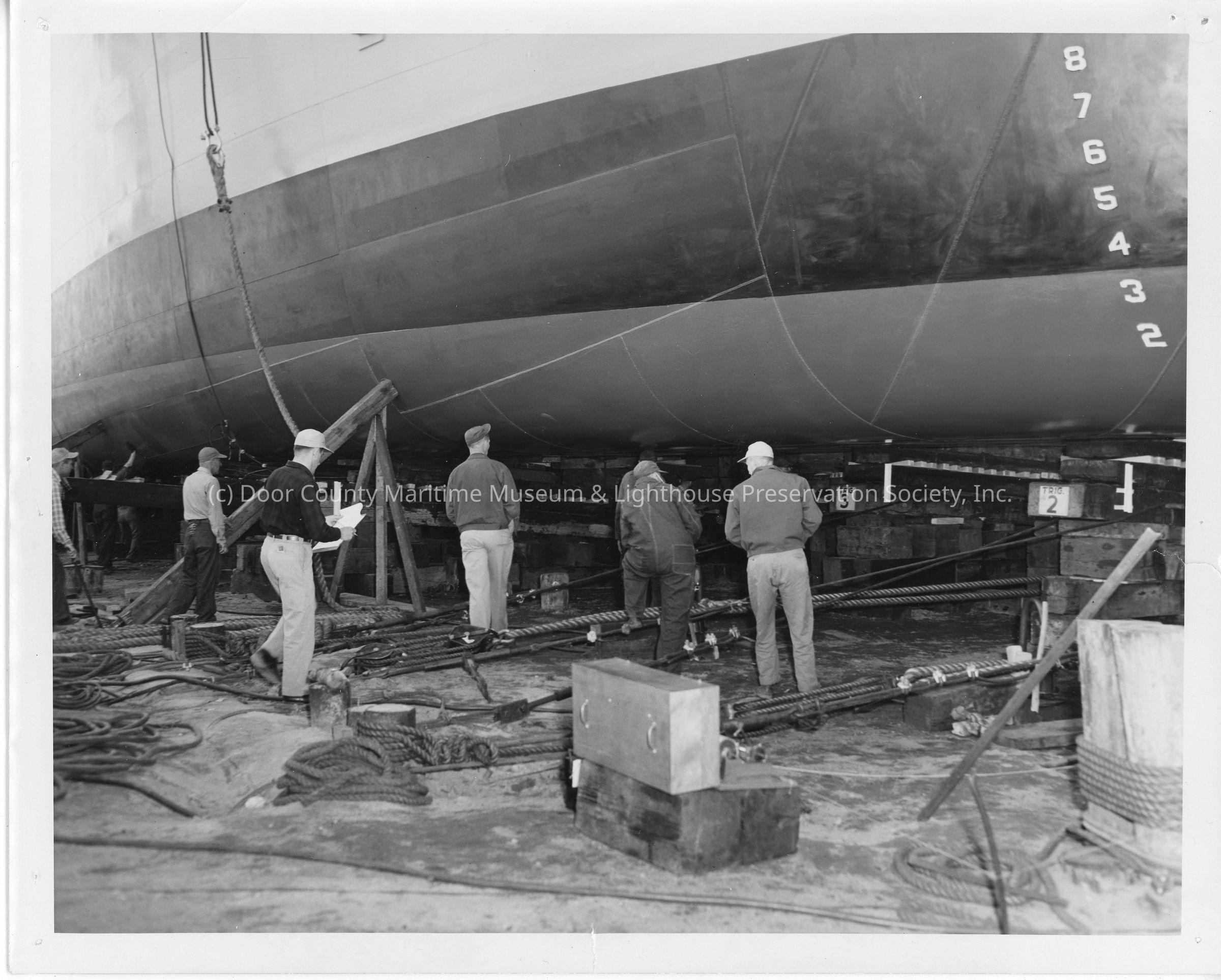 9 men getting LST-1170 being prepared to launch May 22, 1954Entry/Object ID