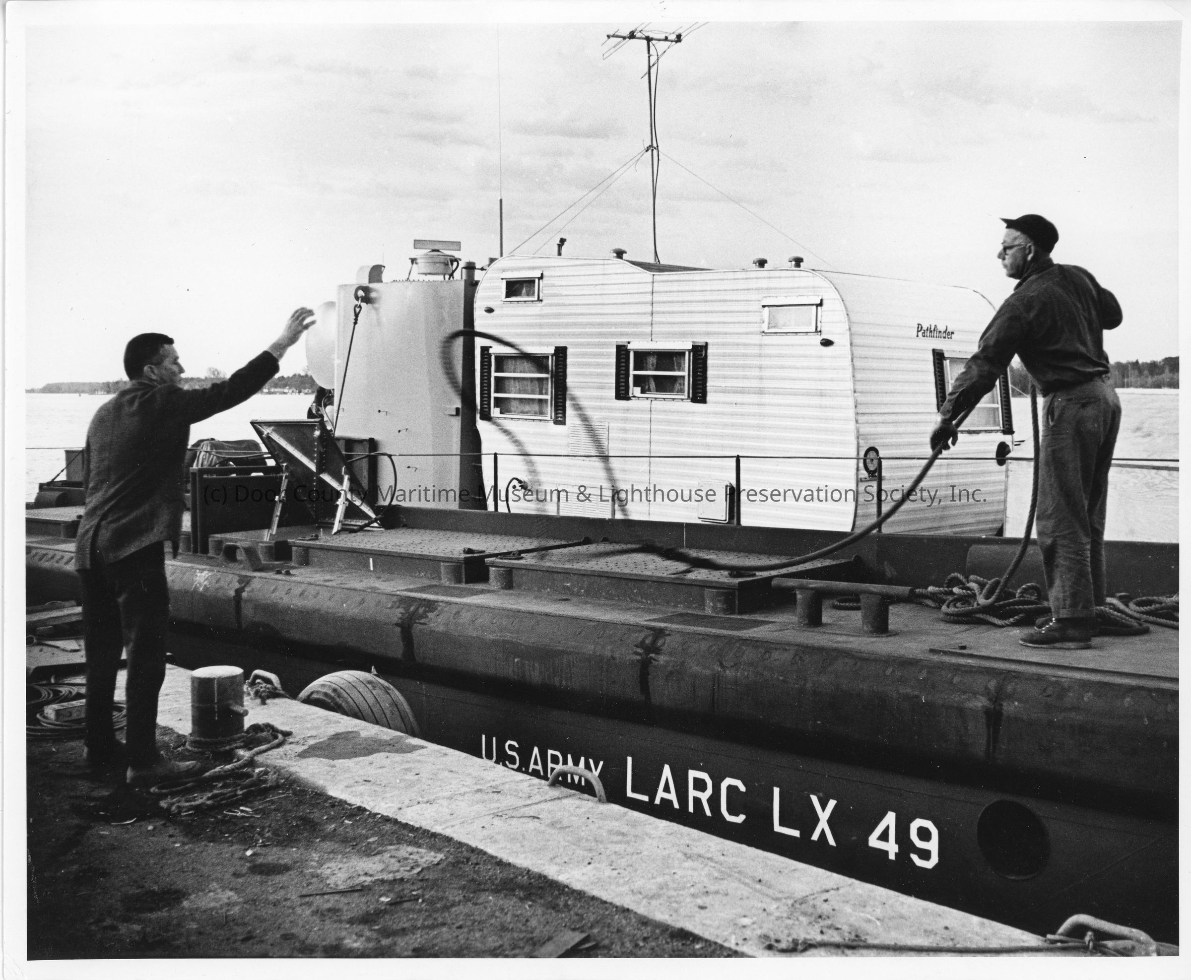 Man pulling in rope while standing on US Army Larc LX 49 with camper insideEntry/Object ID