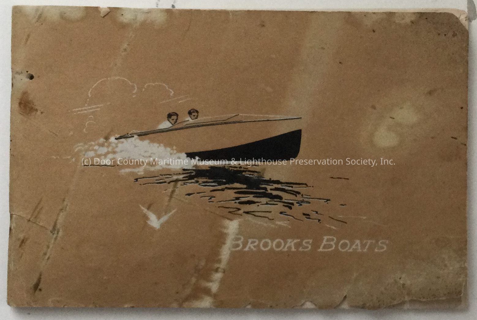 Catalog No.40. "Brooks Boat Company, Inc., Saginaw, Michigan Established 1900, incorporated 1923" written on front. Cover was originially blue, but has become tan with age. Has one punch hole. "Brooks Boats" is on the front cover in white ink along with a drawing of a pleasure boat carrying two people. contains 64 pages with drawings, photographs, and specs of boats for sale. Back cover has a depiction of a life ring with "Brooks system" written on it.Location