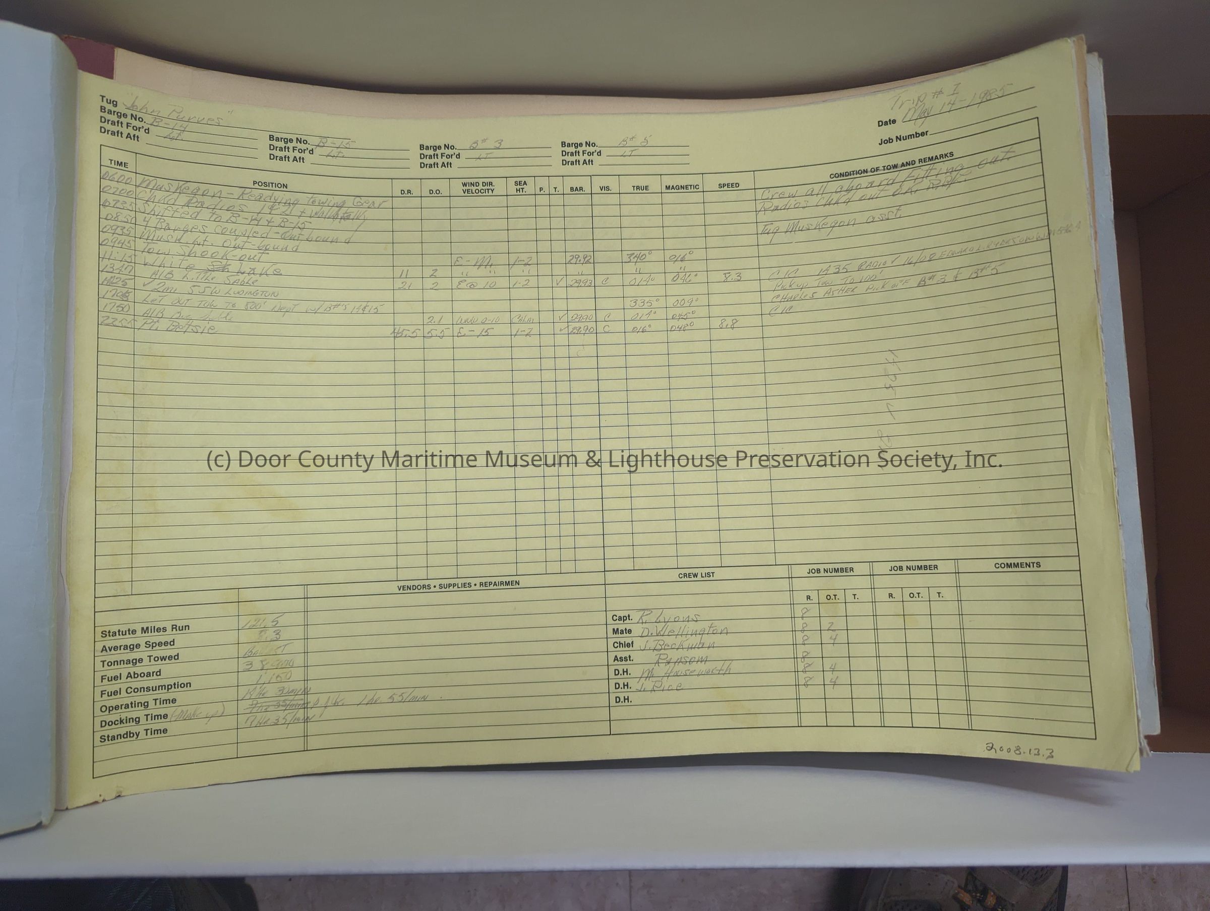 logs from tug "John Purves". Light blue cover with yellow pages. Belongs to Canonie. Dates from 5/13/1985-7/19/1985.Location