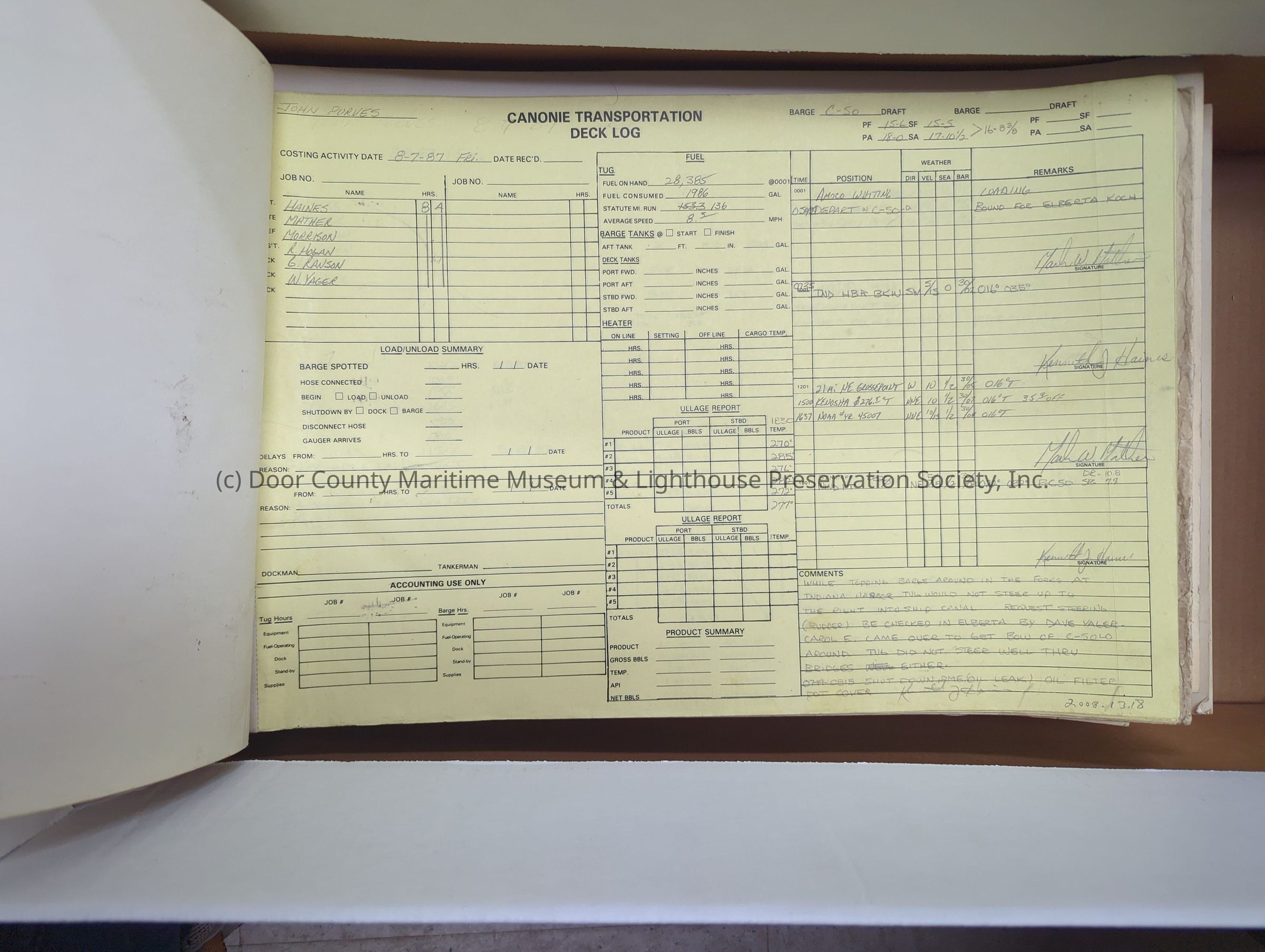 logs from tug "John Purves". Cream colored cover with yellow pages. Belongs to Canonie. Dates from 8/7/1897-9/26/1987Location