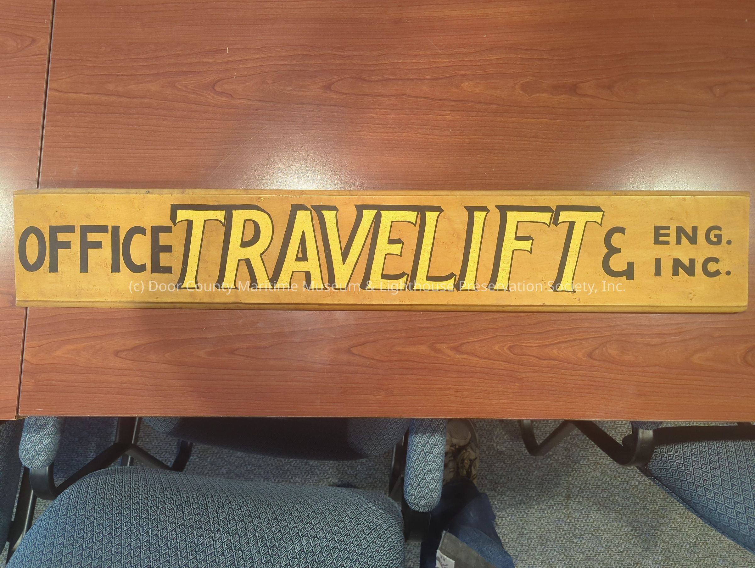 Wooden sign with text that reads "Office Travelift and Eng. Inc." Two metal eye hooks on top for hangingLocation