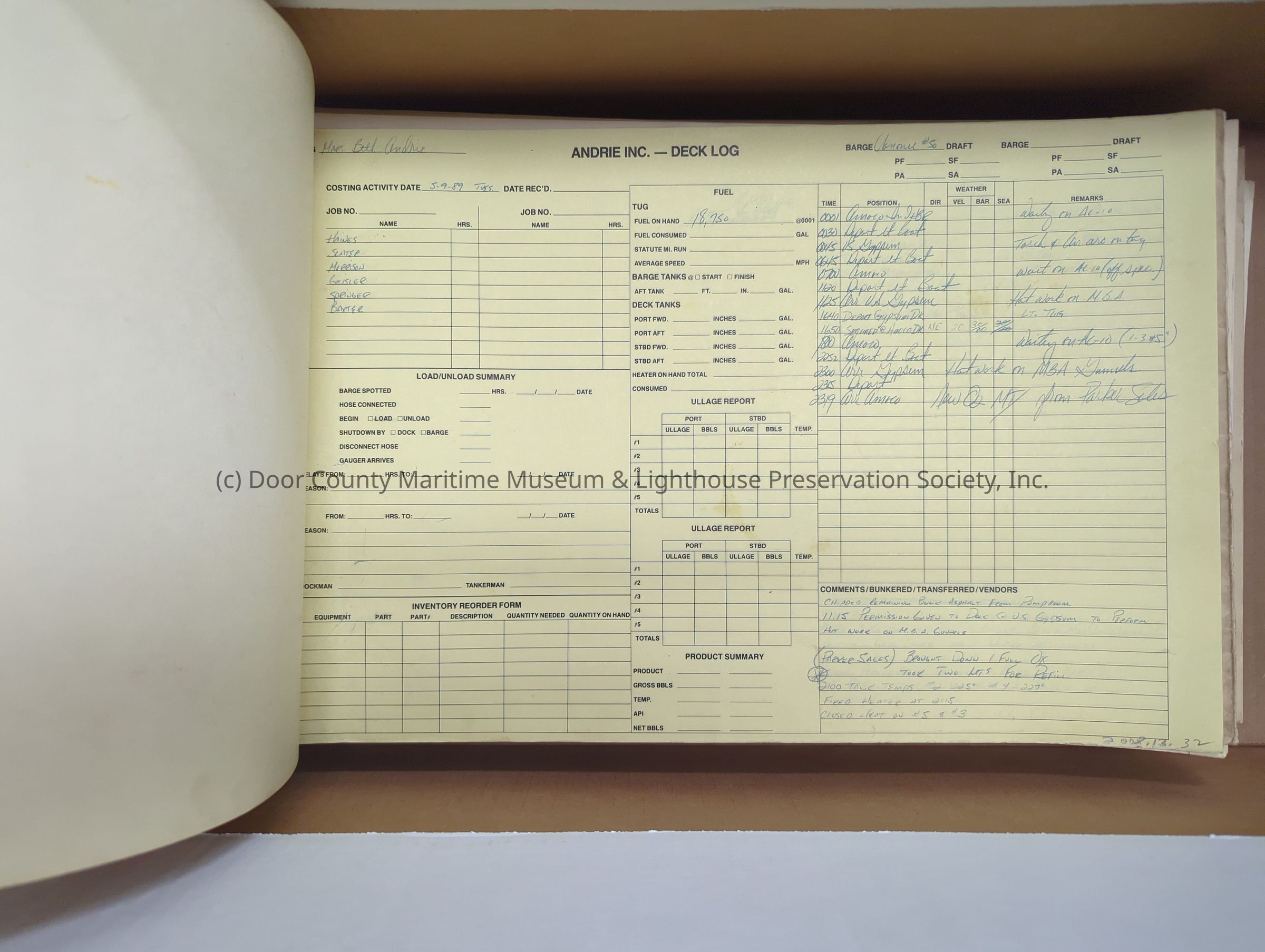 logs from tug "John Purves". Cream colored cover. Belongs to Andrie Inc. Dates from 5/9/1989-6/12/1989Location