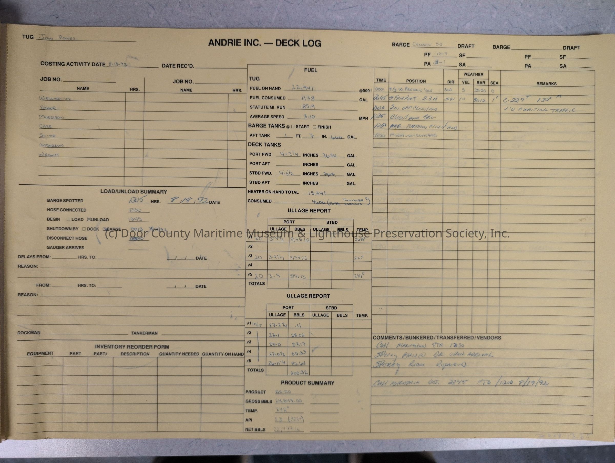 logs from tug "John Purves". Cream colored cover. Belongs to Andrie Inc. Dates from 8/18/1992-9/16/1992Location