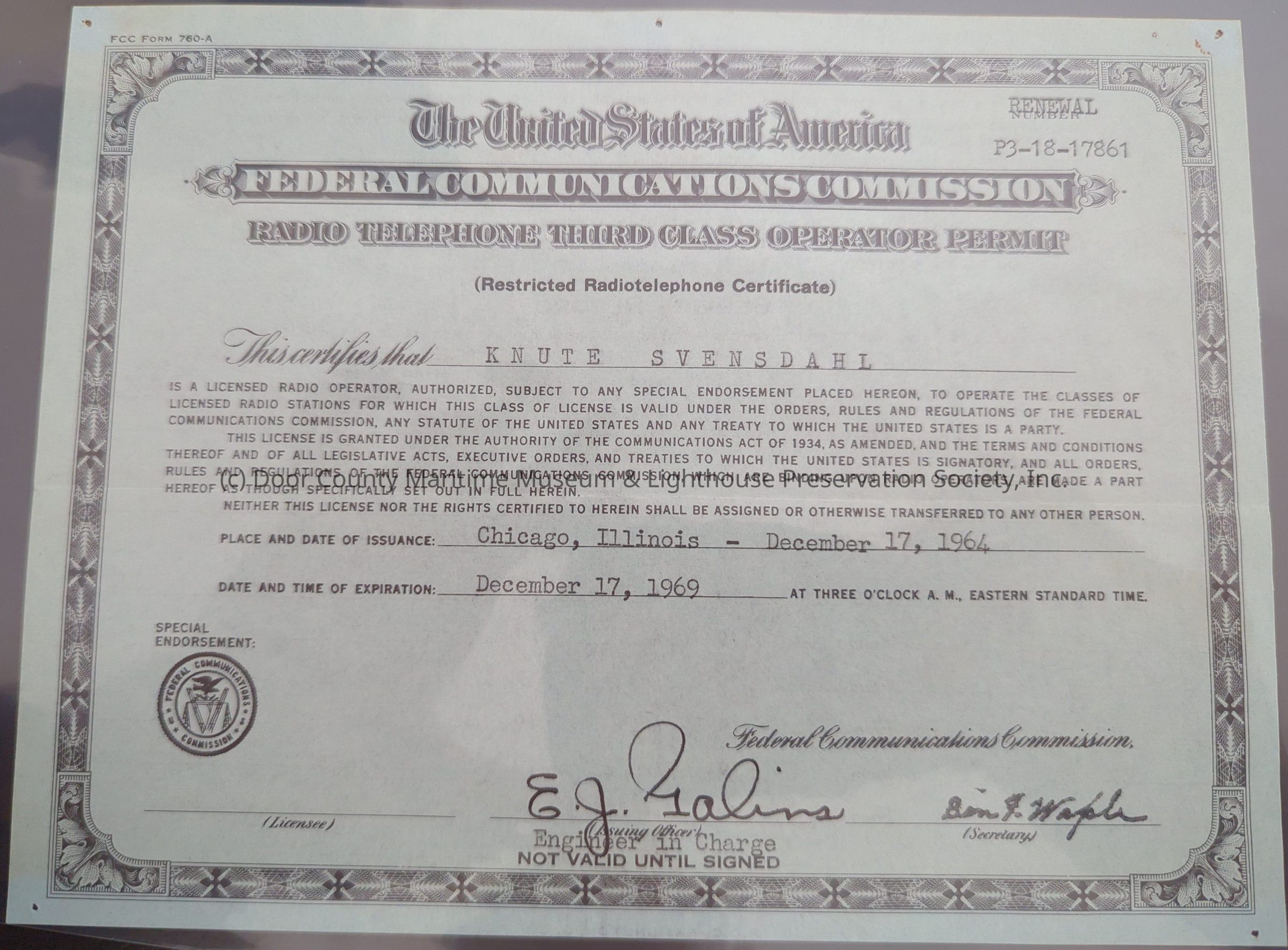 USA Federal communication commission. "Radio Telephone Third Class Operators Permit" issued to Knute Svensdahl on December 17, 1964. Knute Svensdahl used this permit on the "John Roen IV".Location