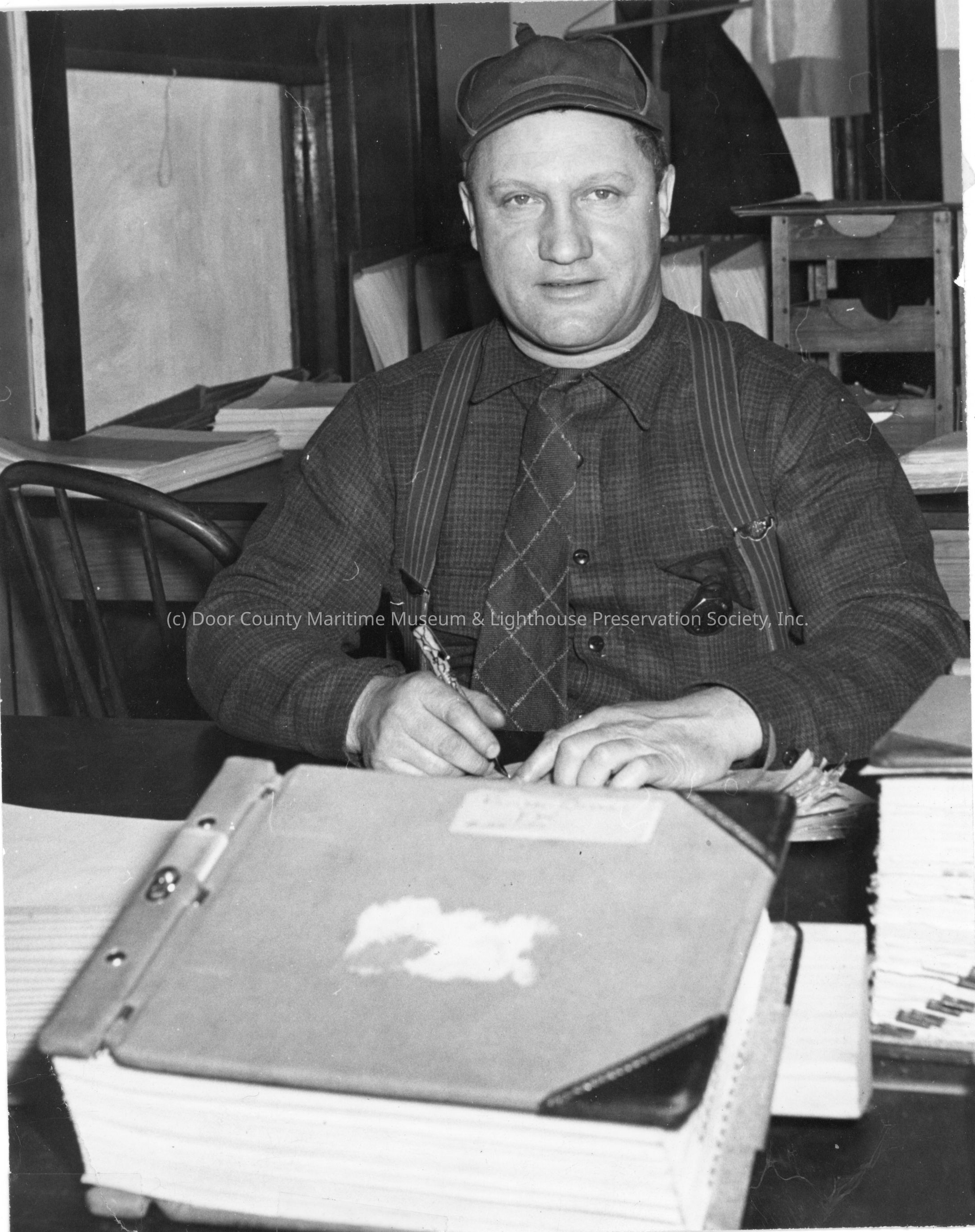 Man in suspenders and tie writing in ledger at deskEntry/Object ID