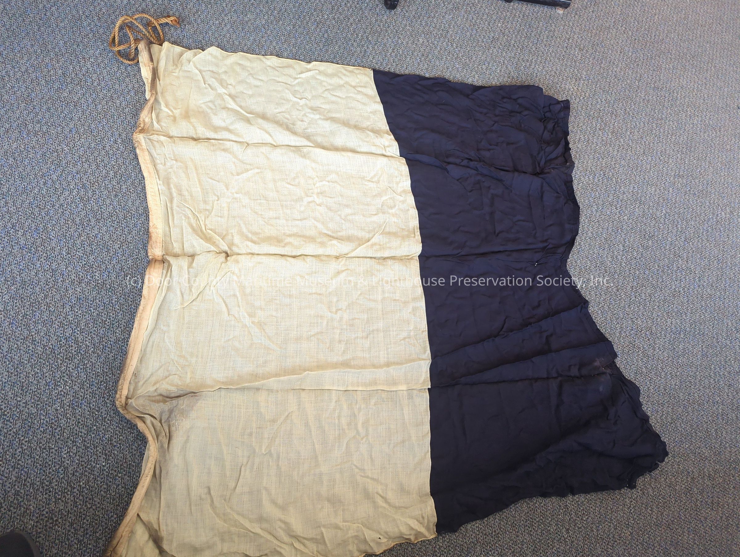 Signal flag: "A"; square, but with "indent" on right side; white (straight), blue (indent); dirty.Location
