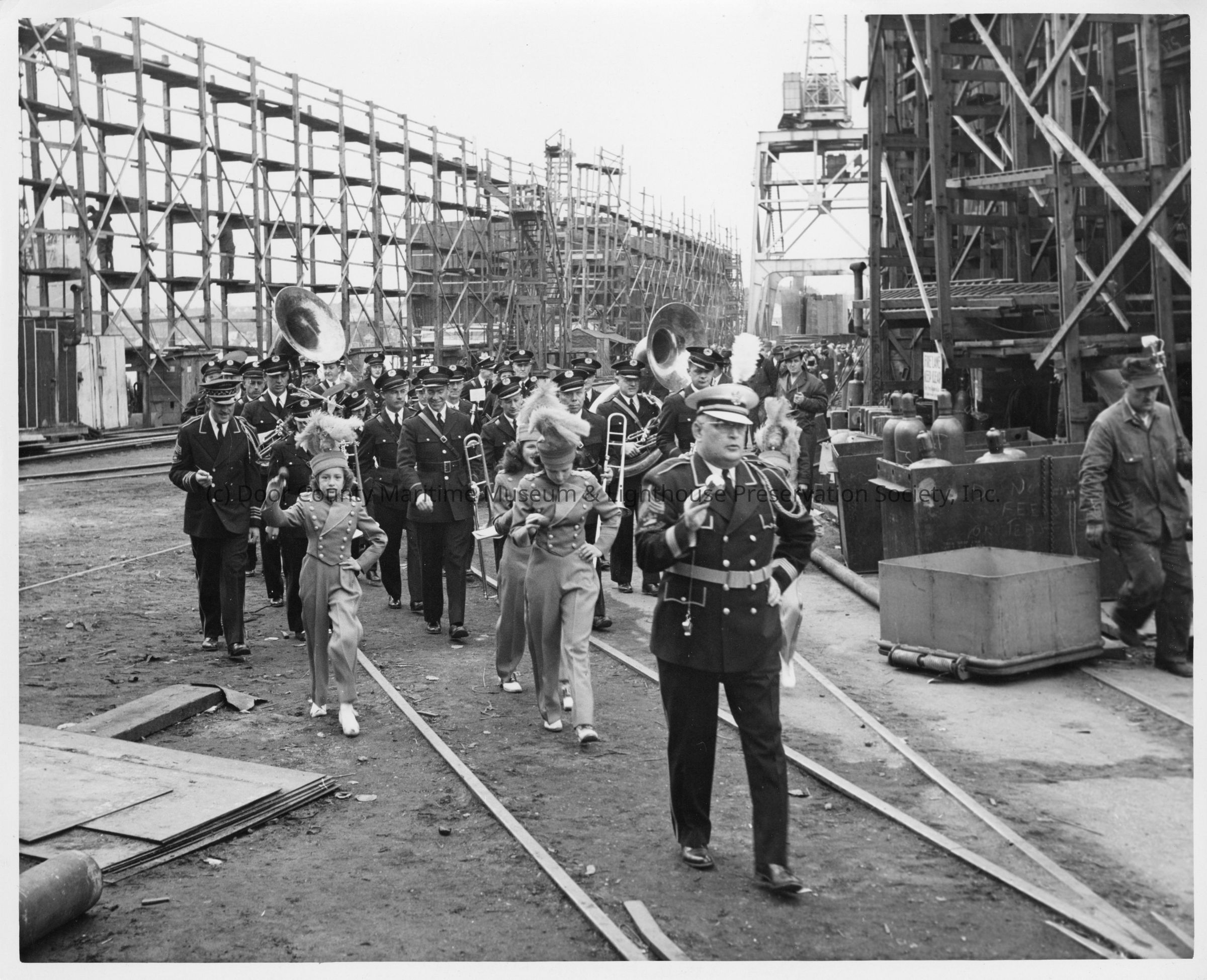 Uniformed marching band going through Leathem D. Smith Shipbuilding co. YardEntry/Object ID