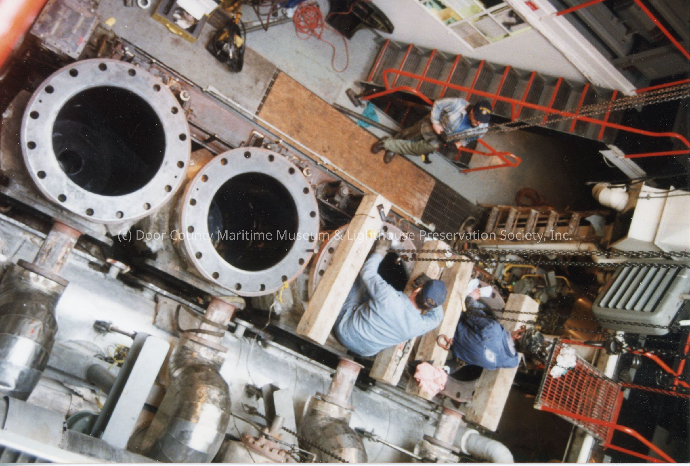 Aerial view of men working on engine of Medusa Challenger January 1998