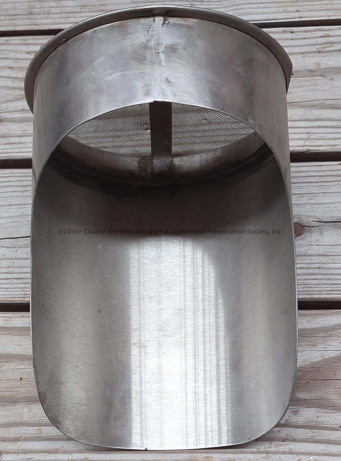 Hand made air scoop. silver metal circular hood with silver metal screen. Silver metal bar in front of screen