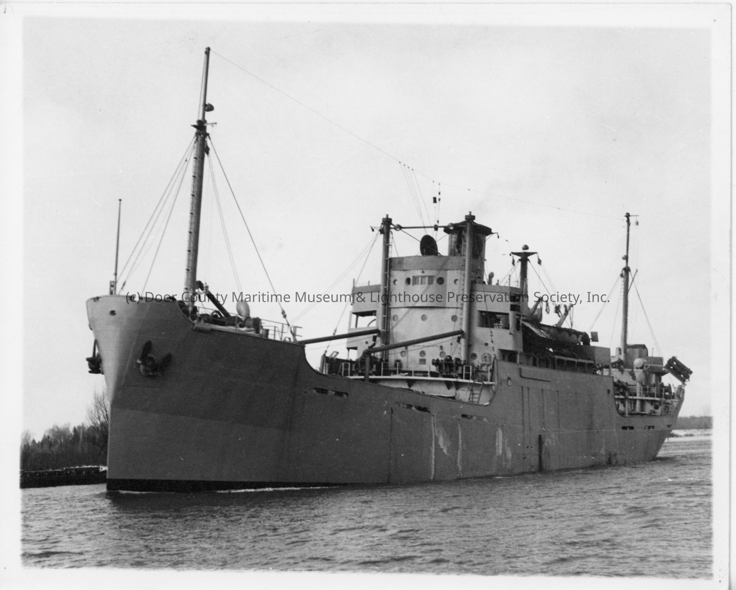Colorless photograph of the coastal cargo ship "Alden Gifford" leaving Sturgeon Bay.Location