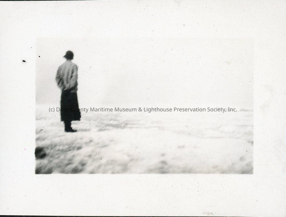 Alice Hotz stands on the shoreline at Glencoe, Illinois, February 1924