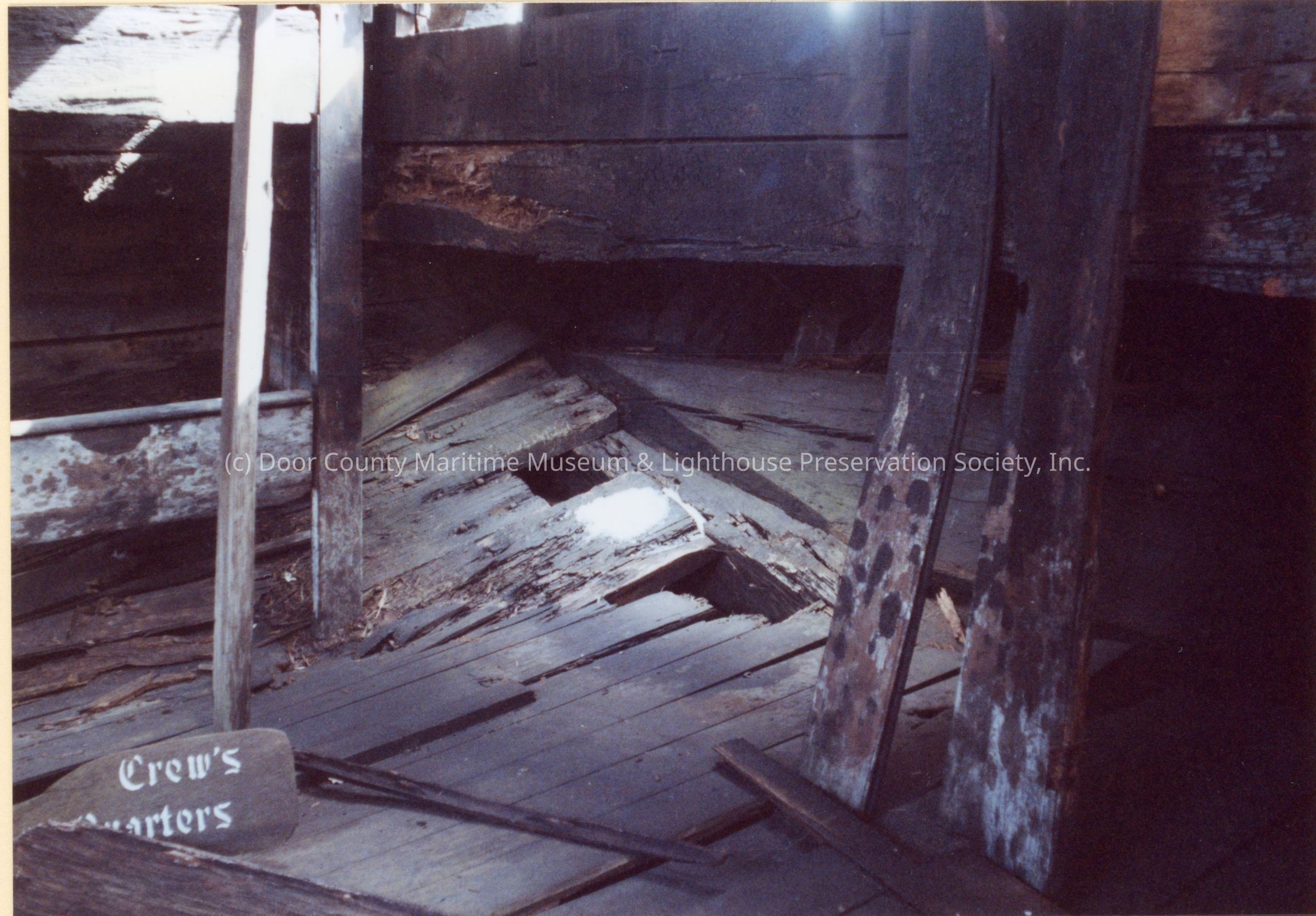 Aft starboard corner of quarters; transom and ceiling are visibleLocation