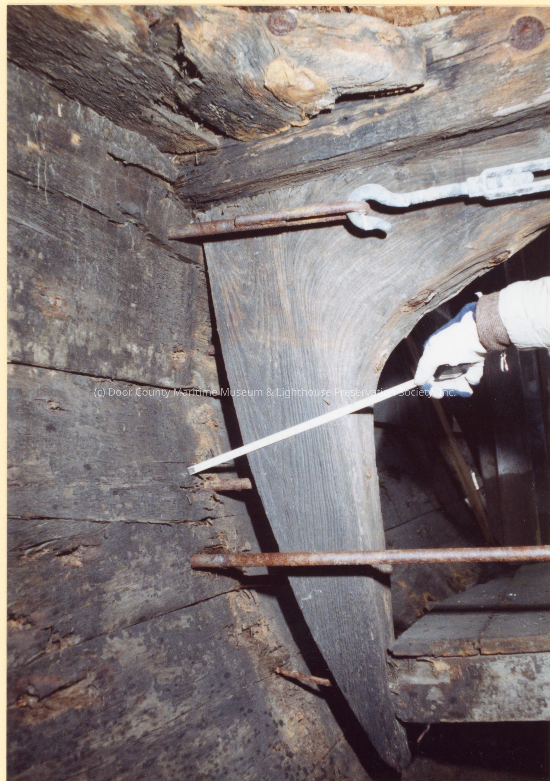 Hanging knee at forward end of quarters, starboard side, showing severe distortion of hull despite tie rodsLocation