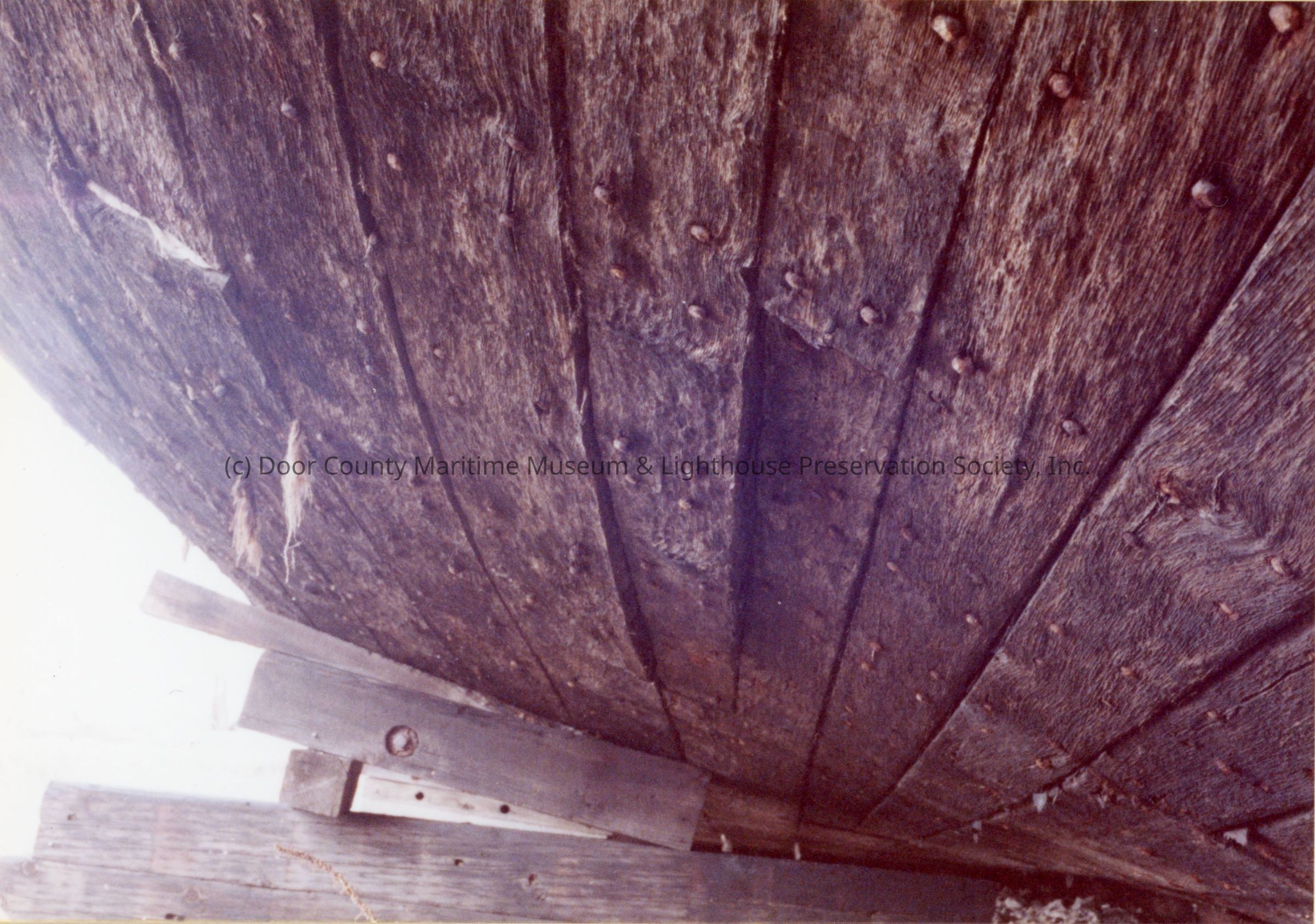 Planking on bottom of counter on port side reveals irregularities due to decay of framesLocation