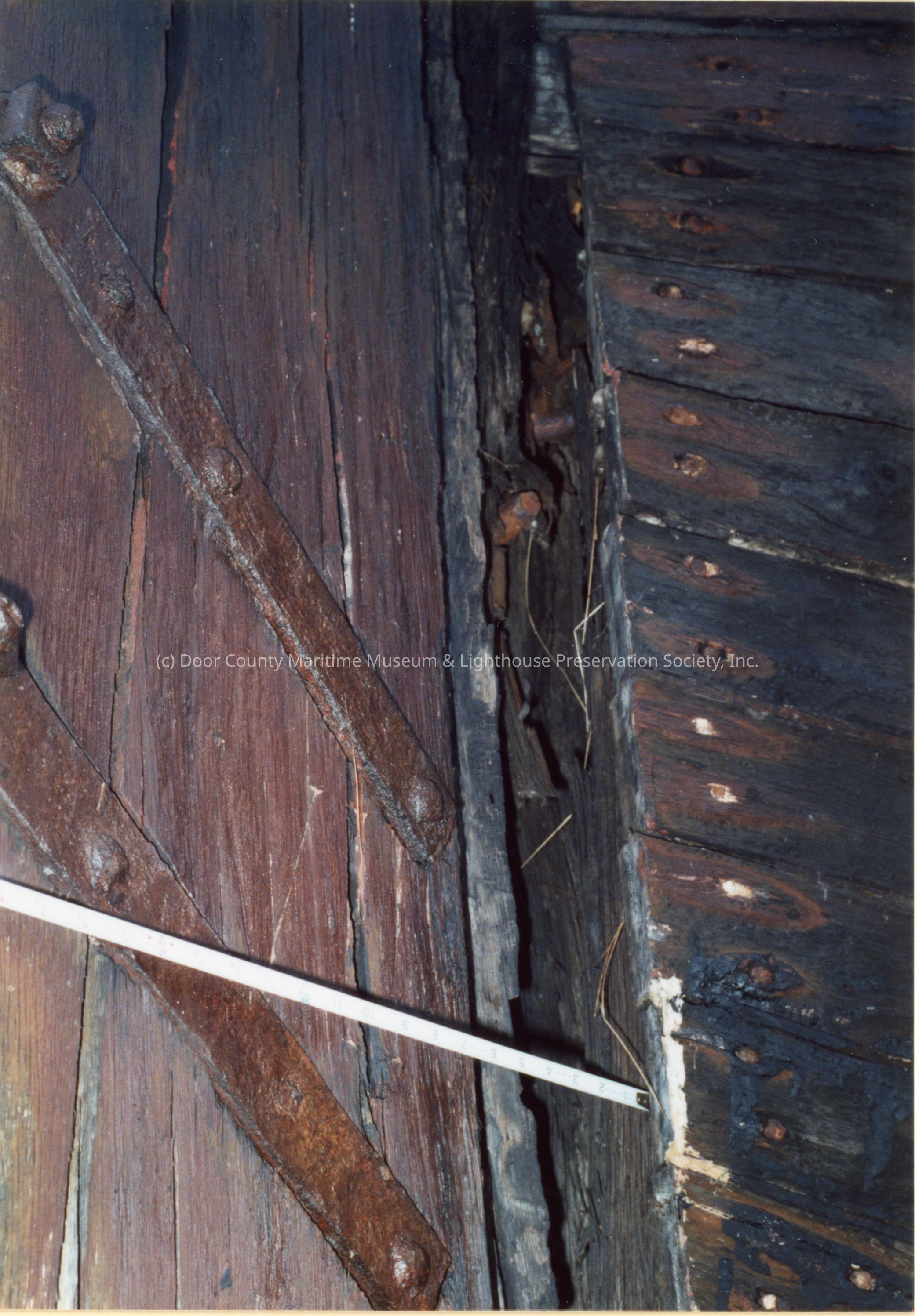 view into split on port side of stem. relative movement between stem and planking is over six inchesLocation