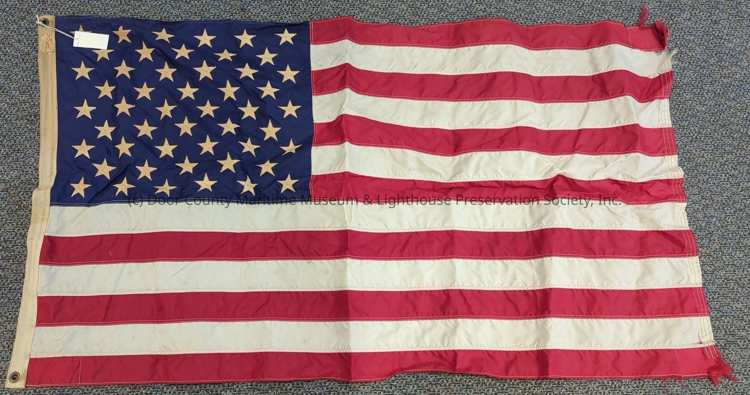 Flag: American; 50 white stars; blue field; red and white stripes; white border on one end with two metal eyelets.Location
