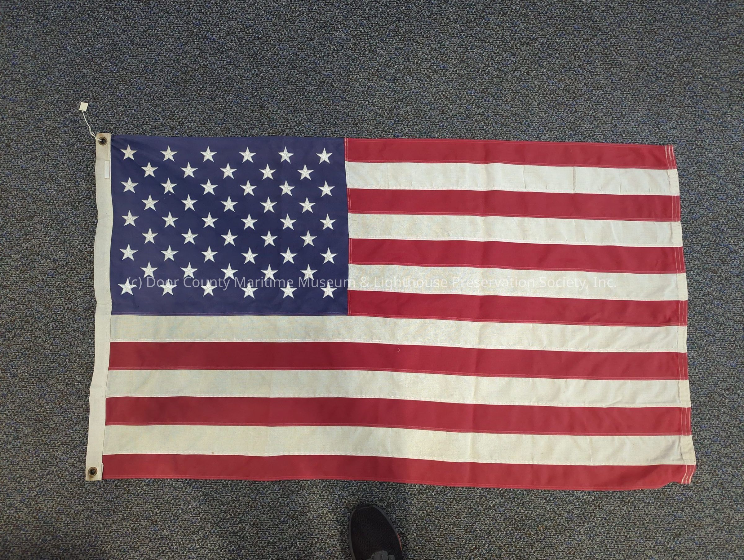 Flag: American; red and white stripes; blue field; white stars; two metal eyelets on one end for hanging.Location