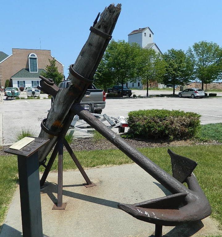 Anchor; overall color brown metal/gray wood; metal corroded; wood weathered; four metal rings on wood cross member to hold wood together; metal flukes and shaft;Location